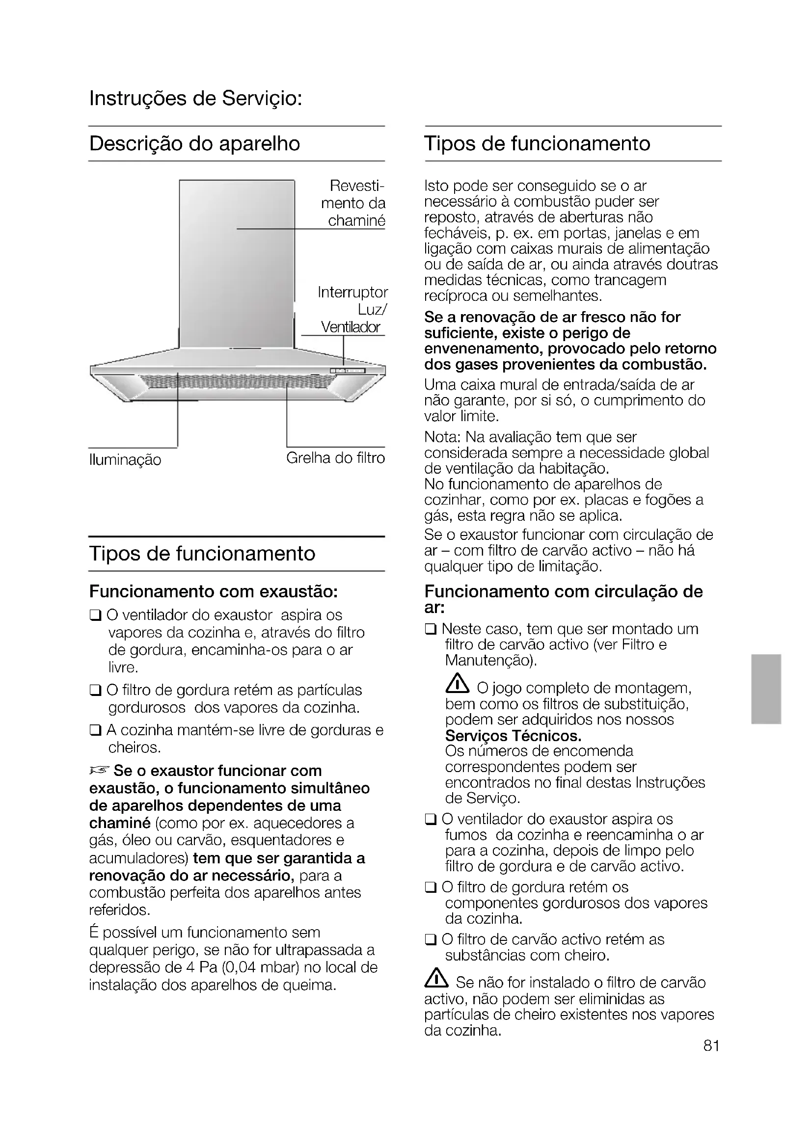 agujeros de la rejilla protectora correspondientes a los tornillos de sujeción inferiores.Iluminação Interruptor Luz/ Ventilador Grelha do filtro Revesti- mento da chaminé Descrição do aparelho Instruções de Serviçio: Tipos de funcionamento Funcionamento com exaustão: ❑ O ventilador do exaustor aspira os vapores da cozinha e, através do filtro de gordura, encaminha-os para o ar livre. ❑ O filtro de gordura retém as partículas gordurosos dos vapores da cozinha. ❑ A cozinha mantém-se livre de gorduras e cheiros.