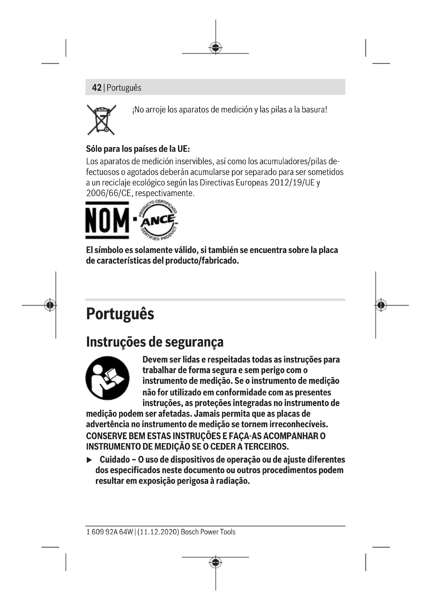 a 20–25°C C) Os valores indicados pressupõem condições ambiente normais a favoráveis (p. ex. ausência de vibração, nevoeiro, fumo, radiação solar direta). Após fortes oscilações de temperatura podem ocorrer desvios de precisão. D) Só surge sujidade não condutora, mas ocasionalmente é esperada uma condutividade temporária causada por condensação. Para uma identificação inequívoca do seu instrumento de medição, consulte o número de série (11) na placa de identificação. Montagem Colocar/trocar pilhas Para a operação do instrumento de medição, é recomendável utilizar pilhas de mangano alcalino. Para abrir a tampa do compartimento das pilhas (9), prima o travamento (12) na direção da seta e retire a tampa. Introduzir as pilhas fornecidas. Tenha atenção à polaridade correta de acordo com a representação no interior do compartimento das pilhas. Se as pilhas ficarem fracas, as linhas de laser piscam por alguns segundos num ritmo rápido. Substitua sempre todas as pilhas em simultâneo. Utilize apenas pilhas de um fabricante e com a mesma capacidade. u Retire as pilhas do instrumento de medição se não forem utilizadas durante longos períodos. Em caso de armazenamento prolongado no instrumento de medição, as pilhas podem ficar corroídas ou descarregar- se automaticamente. Funcionamento Colocação em funcionamento u Proteja o instrumento de medição da humidade e da radiação solar direta. 1 609 92A 64W | (11.12.2020) Bosch Power ToolsPortuguês | 47 u Não exponha o instrumento de medição a temperaturas extremas ou oscilações de temperatura. Não os deixe, p. ex., ficar durante muito tempo no automóvel. No caso de oscilações de temperatura maiores, deixe o instrumento de medição atingir a temperatura ambiente antes de o utilizar. No caso de temperaturas ou de oscilações de temperatura extremas é possível que a precisão do instrumento de medição seja prejudicada. u Evite quedas ou embates violentos com o instrumento de medição. Os danos causados no instrumento de medição podem afetar a precisão de medição. Após uma pancada ou uma queda forte, compare a linha laser para efeitos de controlo com uma linha de referência vertical ou horizontal conhecida. u Desligue o instrumento de medição quando o transporta. A unidade pendular é bloqueada logo que o instrumento for desligado, caso contrário poderia ser danificado devido a fortes movimentos. Ligar/desligar Para ligar o instrumento de medição, puxe o interruptor de ligar/desligar (4) para cima. Imediatamente após a ligação, o instrumento de medição projeta linhas laser a partir do ponto de saída (5). Para desligar o instrumento de medição, empurre o interruptor de ligar/ desligar(4) para baixo sobre o ponto de saída(5). u Não deixe o instrumento de medição ligado sem vigilância e desligue o instrumento de medição após utilização. Outras pessoas poderiam ser cegadas pelo raio laser. Nivelamento automático Coloque o instrumento de medição sobre uma base firme e horizontal, fixe-o no suporte(16) ou no tripé(6). Para trabalhar com o nivelamento automático, é necessário que o lado inferior do instrumento de medição fique na horizontal e com o suporte de tripé(8) alinhado para baixo. Após a ligação o nivelamento automático nivela automaticamente desníveis dentro da gama de auto nivelamento de ±4°. O nivelamento está concluído assim que as linhas de laser deixarem de piscar. Se não for possível efetuar o nivelamento automático, p. ex. porque o lado inferior do instrumento de medição se desvia mais de4° do plano horizontal ou porque o instrumento de medição está a ser segurado livremente na mão, as linhas laser piscam permanentemente num ritmo lento e o instrumento de Bosch Power Tools 1 609 92A 64W | (11.12.2020)48 | Português medição trabalha sem nivelamento automático. As linhas de laser permanecem ligadas, mas as duas linhas cruzadas deixam de ser mover obrigatoriamente em ângulo reto. Para assegurar que as duas linhas de laser continuam a mover-se em ângulo reto, posicionar o instrumento de medição perpendicularmente em relação à parede. Em caso de vibrações ou de alteração da posição durante o funcionamento, o instrumento de medição volta a ser nivelado automaticamente. Após um novo nivelamento, verificar a posição horizontal ou vertical das linhas de laser relativamente aos pontos de referência para evitar erros, deslocando o instrumento de medição. Instruções de trabalho u Use sempre apenas o centro da linha laser para marcar. A largura da linha laser altera-se com a distância. Fixação com o suporte (verfiguraA) Com a ajuda do suporte(16) pode fixar o instrumento de medição a diferentes objetos com uma espessura de 10 a 60mm, por exemplo, a tábuas ou tubos verticais ou horizontais. Solte o parafuso de fixação(15) do suporte e coloque o suporte na posição desejada e volte a apertar o parafuso de fixação. Coloque o instrumento de medição com o suporte de tripé(8) no parafuso de 1/4"(13) do suporte e aperte-o com força moderada no suporte. Não aperte demasiadamente o instrumento de medição, caso contrário ele pode ser danificado. Alinhe aproximadamente o suporte antes de ligar o instrumento de medição. Solte o parafuso de fixação(14) do suporte. Desloque o instrumento de medição para a altura desejada numa posição horizontal (com o suporte de tripé(8) para baixo). Reapertar o parafuso de fixação. Também é possível fixar o instrumento de medição no suporte com a placa adaptadora(3). Trabalhar com um tripé (acessório) Um tripé assegura uma base de medição estável e ajustável em altura. Coloque o instrumento de medição com o suporte de tripé der 1/4" (8) na rosca do tripé (6) ou num tripé de máquina fotográfica convencional. Fixe o instrumento de medição com o parafuso de fixação do tripé. Alinhar aproximadamente o tripé antes de ligar o instrument