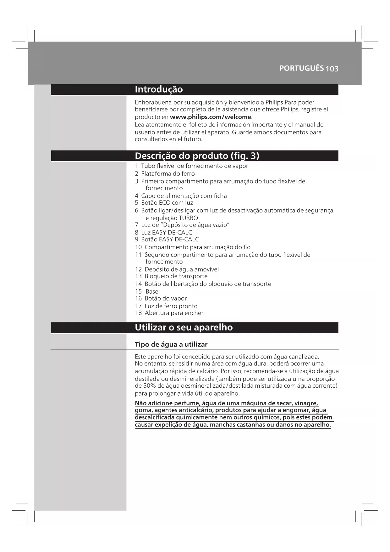 Problema Posible causa Solución Sale vapor o agua por debajo de la rueda EASY DE- CALC. La rueda EASY DE-CALC no se ha apretado correctamente. Apague el aparato y deje que se enfríe durante 2 horas. Desenrosque la rueda EASY DE-CALC y vuelva a enroscarla correctamente en el aparato. Nota: Puede que salga un poco de agua cuando extraiga la rueda. La junta de goma de la rueda EASY DE-CALC está desgastada. Póngase en contacto con un centro de servicio autorizado por Philips para obtener una rueda EASY DE-CALC nueva. Sale agua sucia e impurezas por la suela o la suela está sucia. Las impurezas o los componentes químicos del agua se han depositado en los oricios de salida del vapor o en la suela. Limpie la suela con un paño húmedo. Se ha acumulado demasiada cal y partículas minerales dentro del aparato. Elimine los depósitos de cal del aparato con regularidad (consulte el capítulo “Importante: eliminación de los depósitos de cal”). La plancha deja brillo o una marca en la prenda. La supercie que se desea planchar es desigual, por ejemplo porque estaba planchando sobre una costura o un pliegue de la prenda. La plancha PerfectCare es segura en todas las prendas. El brillo o la marca no son permanentes y desaparecerán al lavar la prenda. Evite planchar sobre costuras o pliegues, o bien coloque un paño de algodón sobre el área que desea planchar para evitar marcas en las costuras y pliegues. El aparato no produce vapor. No hay suciente agua en el depósito (el piloto ‘depósito de agua vacío’ parpadea). Llene el depósito de agua (consulte la sección “Llenado del depósito de agua” del capítulo “Uso del aparato”). El aparato no está lo sucientemente caliente como para producir vapor. Espere hasta que el piloto de “plancha lista” se ilumine continuamente. No ha pulsado el botón de vapor. Pulse el botón de vapor y manténgalo pulsado mientras plancha. El depósito de agua no se ha colocado correctamente en el aparato. Coloque rmemente el depósito de agua en el aparato de nuevo (oirá un clic). El aparato no está encendido. Inserte la clavija en la toma de corriente y pulse el botón de encendido/apagado para encender el aparato. El aparato se ha apagado. El piloto del botón de encendido/ apagado parpadea. La función de desconexión automática se activa automáticamente si el aparato no se utiliza durante más de 10 minutos. Pulse el botón de encendido/apagado para encender el aparato de nuevo. El aparato produce un sonido de bombeo. El agua se bombea a la caldera del aparato. Esto es normal. Si el sonido de bombeo no se detiene, apague y desenchufe el aparato de la red. Póngase en contacto con un centro de servicio autorizado por Philips.103 Introdução Enhorabuena por su adquisición y bienvenido a Philips Para poder beneciarse por completo de la asistencia que ofrece Philips, registre el producto en www.philips.com/welcome. Lea atentamente el folleto de información importante y el manual de usuario antes de utilizar el aparato. Guarde ambos documentos para consultarlos en el futuro. Descrição do produto (g. 3) 1 Tubo exível de fornecimento de vapor 2 Plataforma do ferro 3 Primeiro compartimento para arrumação do tubo exível de fornecimento 4 Cabo de alimentação com cha 5 Botão ECO com luz 6 Botão ligar/desligar com luz de desactivação automática de segurança e regulação TURBO 7 Luz de “Depósito de água vazio” 8 Luz EASY DE-CALC 9 Botão EASY DE-CALC 10 Compartimento para arrumação do o 11 Segundo compartimento para arrumação do tubo exível de fornecimento 12 Depósito de água amovível 13 Bloqueio de transporte 14 Botão de libertação do bloqueio de transporte 15 Base 16 Botão do vapor 17 Luz de ferro pronto 18 Abertura para encher Utilizar o seu aparelho Tipo de água a utilizar Este aparelho foi concebido para ser utilizado com água canalizada. No entanto, se residir numa área com água dura, poderá ocorrer uma acumulação rápida de calcário. Por isso, recomenda-se a utilização de água destilada ou desmineralizada (também pode ser utilizada uma proporção de 50% de água desmineralizada/destilada misturada com água corrente) para prolongar a vida útil do aparelho. Não adicione perfume, água de uma máquina de secar, vinagre, goma, agentes anticalcário, produtos para ajudar a engomar, água descalcicadaquimicamentenemoutrosquímicos,poisestespodem causar expelição de água, manchas castanhas ou danos no aparelho. PORTUGUÊS104 Encher o depósito de água Encha o depósito de água antes da cada utilização ou quando a luz de “depósito de água vazio” car intermitente. Pode reabastecer o depósito da água em qualquer altura, durante a utilização. 1 Retire o depósito de água do aparelho e encha-o com água canalizada até à indicação MAX. 2 Volte a colocar o depósito de água no aparelho encaixando primeiro a parte inferior no mesmo. 3 Pressione a parte superior do depósito de água até esta encaixar na posição correta (ouve-se um estalido). Luz de “depósito da água vazio” Quando o depósito de água estiver quase vazio, a luz de “depósito de água vazio” ca intermitente. Encha o depósito de água e prima o botão de vapor para deixar o aparelho aquecer novamente. Quando a luz de “ferro pronto” se acender continuamente, pode continuar a engomar com vapor. Tecnologia OptimalTemp A tecnologia OptimalTemp permite-lhe passar a ferro todos os tipos de tecidos que podem ser engomados, independentemente da ordem, sem ajustar a temperatura do ferro. Os tecidos com estes símbolos podem ser passados a ferro, por exemplo, linho, algodão, poliéster, seda, lã, viscose e rayon. Os tecidos com este símbolo não podem ser passados a ferro. Estes tecidos incluem tecidos sintéticos como spandex ou elastano, tecidos com uma percentagem spandex e poliolenas (por exemplo polipropileno), mas também impressões em peças de roupa. PORTUGUÊS105 Passar a ferro 1 Coloque o depósit
