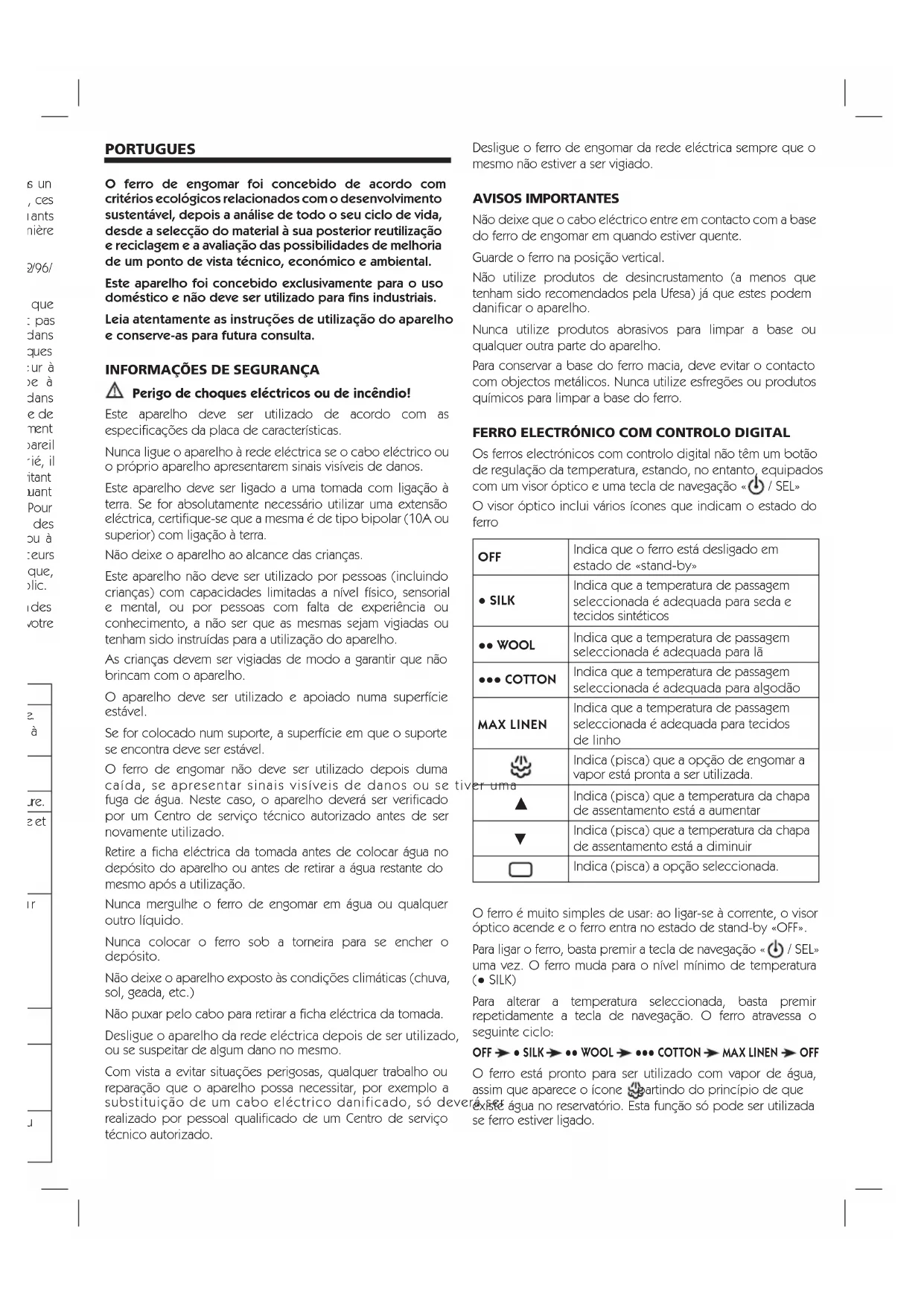 Perigo de choques eléctricos ou de incêndio! Este aparelho deve ser utilizado de acordo com as especificações da placa de características. Nunca ligue o aparelho à rede eléctrica se o cabo eléctrico ou o próprio aparelho apresentarem sinais visíveis de danos. Este aparelho deve ser ligado a uma tomada com ligação à terra. Se for absolutamente necessário utilizar uma extensão eléctrica, certifique-se que a mesma é de tipo bipolar (10A ou superior) com ligação à terra. Não deixe o aparelho ao alcance das crianças. Este aparelho não deve ser utilizado por pessoas (incluindo crianças) com capacidades limitadas a nível físico, sensorial e mental, ou por pessoas com falta de experiência ou conhecimento, a não ser que as mesmas sejam vigiadas ou tenham sido instruídas para a utilização do aparelho. As crianças devem ser vigiadas de modo a garantir que não brincam com o aparelho. O aparelho deve ser utilizado e apoiado numa superfície estável. Se for colocado num suporte, a superfície em que o suporte se encontra deve ser estável. O ferro de engomar não deve ser utilizado depois duma caída, se apresentar sinais visíveis de danos ou se tiver uma fuga de água. Neste caso, o aparelho deverá ser verificado por um Centro de serviço técnico autorizado antes de ser novamente utilizado. Retire a ficha eléctrica da tomada antes de colocar água no depósito do aparelho ou antes de retirar a água restante do mesmo após a utilização. Nunca mergulhe o ferro de engomar em água ou qualquer outro líquido. Nunca colocar o ferro sob a torneira para se encher o depósito. Não deixe o aparelho exposto às condições climáticas (chuva, sol, geada, etc.) Não puxar pelo cabo para retirar a ficha eléctrica da tomada. Desligue o aparelho da rede eléctrica depois de ser utilizado, ou se suspeitar de algum dano no mesmo. Com vista a evitar situações perigosas, qualquer trabalho ou reparação que o aparelho possa necessitar, por exemplo a substituição de um cabo eléctrico danificado, só deverá ser realizado por pessoal qualificado de um Centro de serviço técnico autorizado. Desligue o ferro de engomar da rede eléctrica sempre que o mesmo não estiver a ser vigiado. AVISOS IMPORTANTES Não deixe que o cabo eléctrico entre em contacto com a base do ferro de engomar em quando estiver quente. Guarde o ferro na posição vertical. Não utilize produtos de desincrustamento (a menos que tenham sido recomendados pela Ufesa) já que estes podem danificar o aparelho. Nunca utilize produtos abrasivos para limpar a base ou qualquer outra parte do aparelho. Para conservar a base do ferro macia, deve evitar o contacto com objectos metálicos. Nunca utilize esfregões ou produtos químicos para limpar a base do ferro.