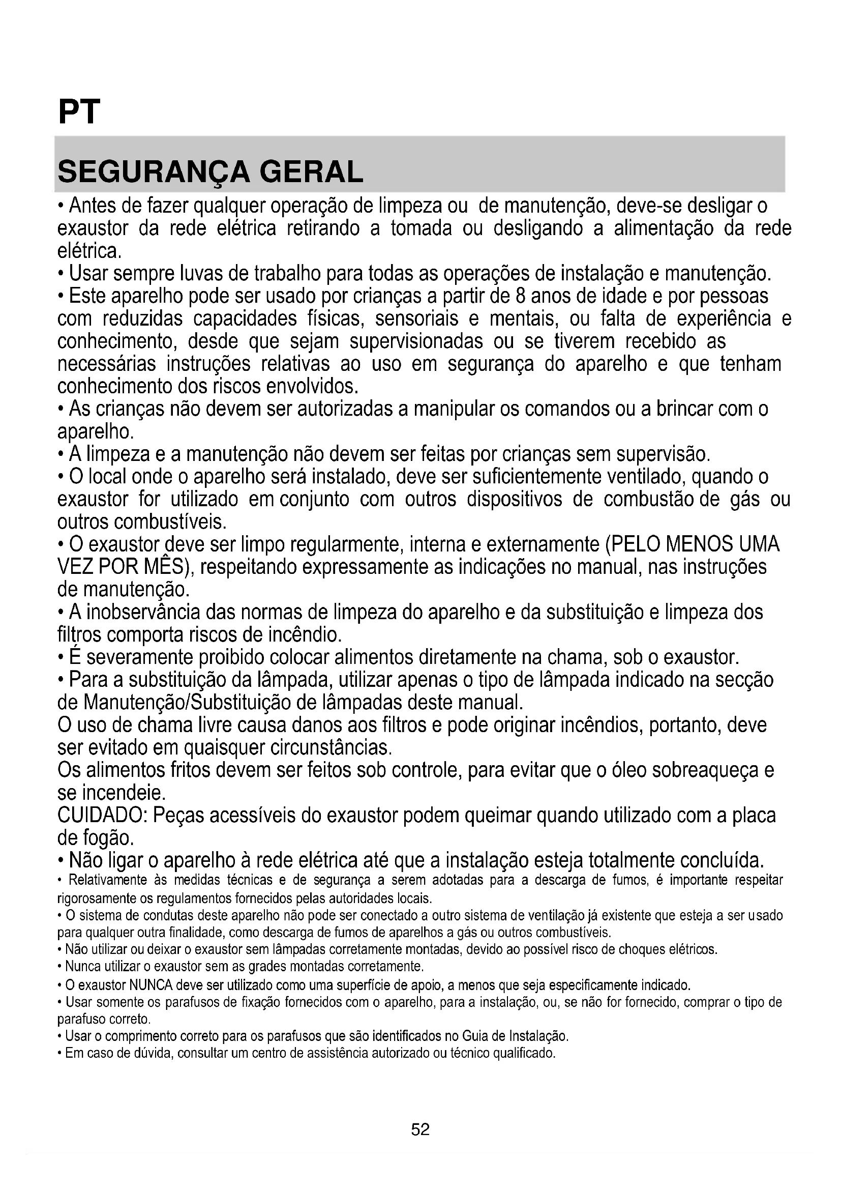 - Para a substituição da lâmpada, utilizar apenas o tipo de lâmpada indicado na secção de Manutenção/Substituição de lâmpadas deste manual. O uso de chama livre causa danos aos filtros e pode originar incêndios, portanto, deve ser evitado em quaisquer circunstâncias. Os alimentos fritos devem ser feitos sob controle, para evitar que o óleo sobreaqueça e se incendeie. CUIDADO: Peças acessíveis do exaustor podem queimar quando utilizado com a placa de fogão.