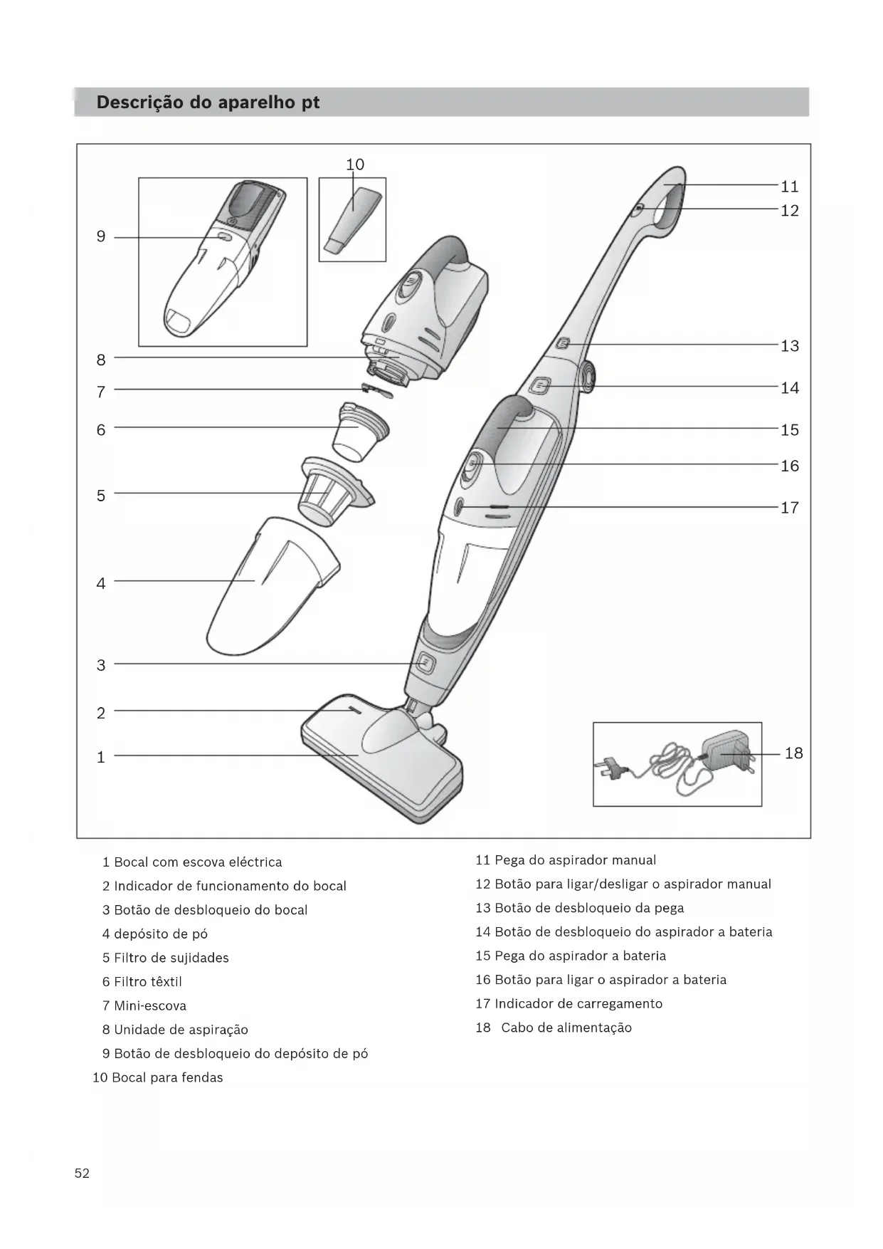 1 Bocal com escova eléctrica 2 Indicador de funcionamento do bocal 3 Botão de desbloqueio do bocal 4 depósito de pó 5 Filtro de sujidades 6 Filtro têxtil 7 Mini-escova 8 Unidade de aspiração 9 Botão de desbloqueio do depósito de pó 10 Bocal para fendas 11 Pega do aspirador manual 12 Botão para ligar/desligar o aspirador manual 13 Botão de desbloqueio da pega 14 Botão de desbloqueio do aspirador a bateria 15 Pega do aspirador a bateria 16 Botão para ligar o aspirador a bateria 17 Indicador de carregamento 18 Estação de carregamento 19 Suporte de base da estação de carregamento 20 Cabo de alimentação Cabo de alimentação Descrição do aparelho pt53