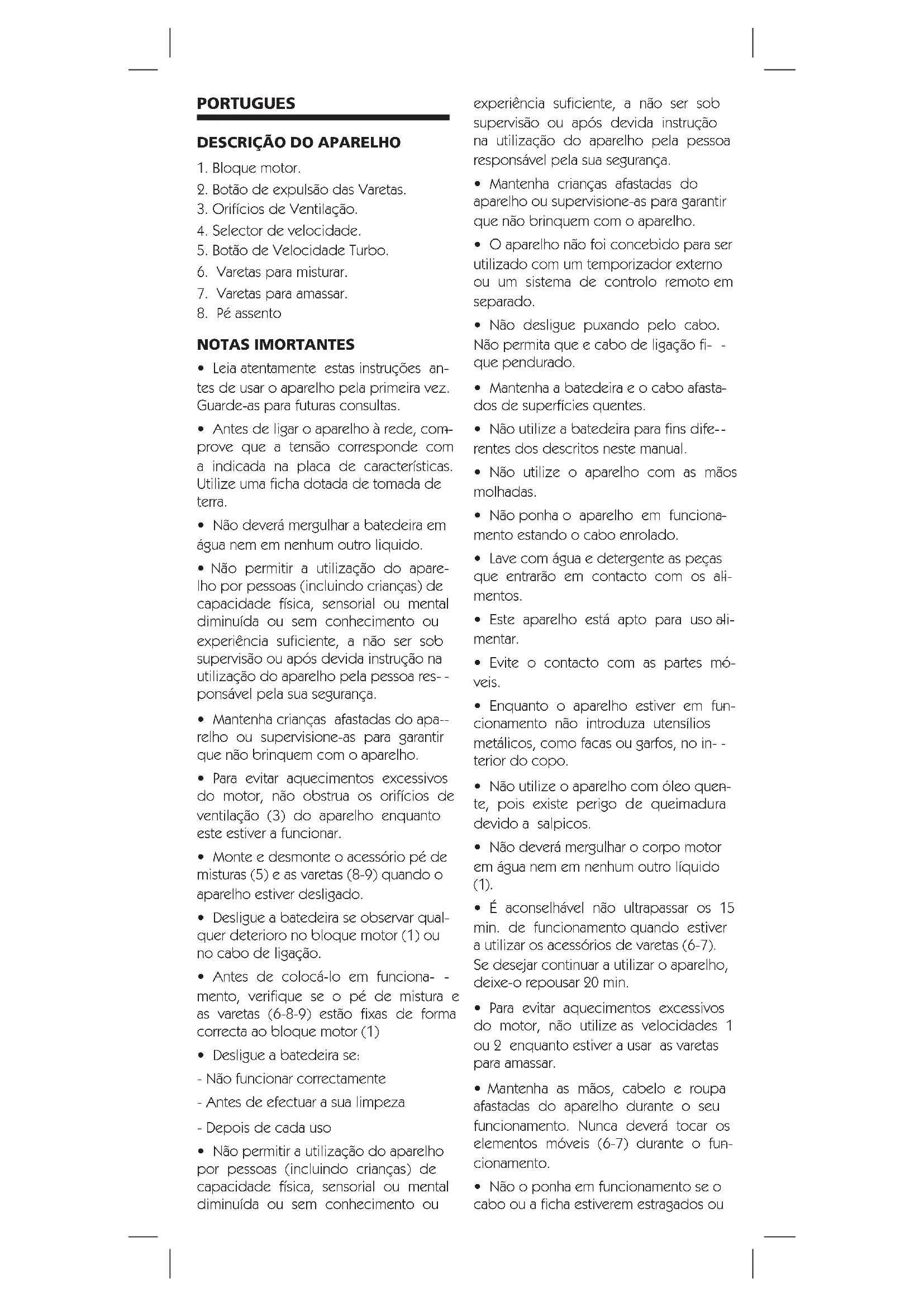 - É aconselhável não ultrapassar os 15 min. de funcionamento quando estiver a utilizar os acessórios de varetas (6-7). Se desejar continuar a utilizar o aparelho, deixe-o repousar 20 min.