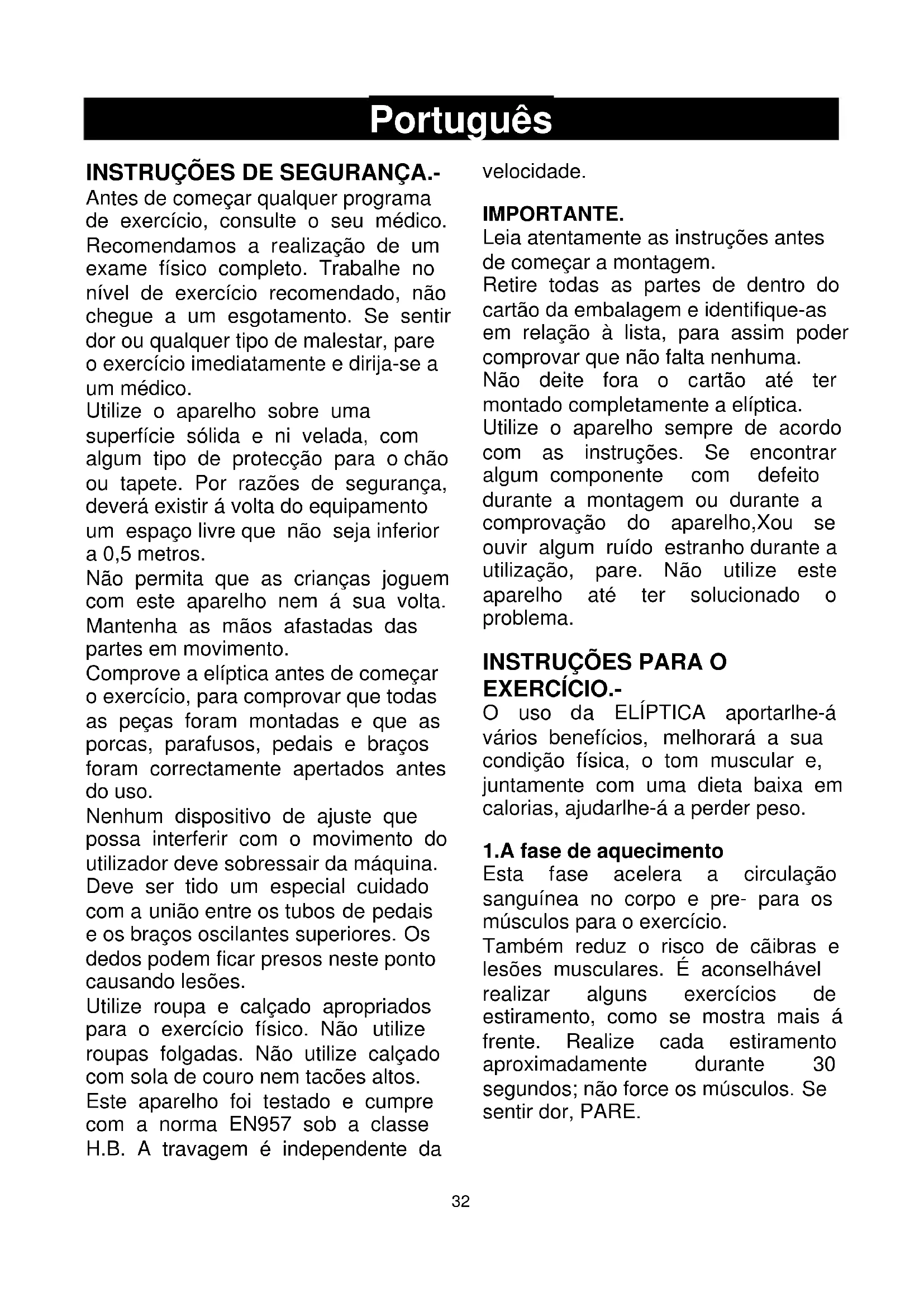 Utilize roupa e calculado apropriados para o exercicio fisico. Não utilize roupas folgadas. Não utilize calculado com sola de couro nem tações altos. Este aparecido foi testado e@cumpre com a norma EN957 sob a classe H.B. A travagem é independente da