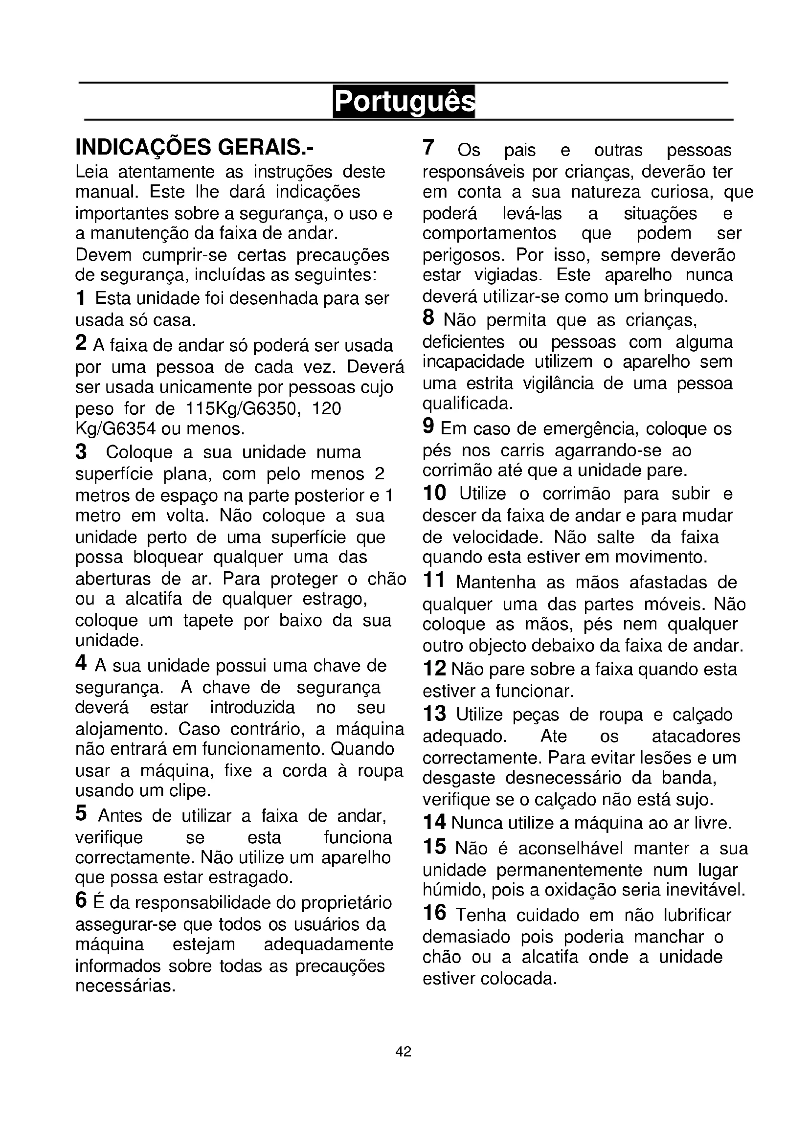 2 A faixa de andar so poderá ser usada por uma pessoa de cada vez. Deverá ser usada uniquamente por pessoas cujo peso for de 115Kg/G6350, 120 Kg/G6354 ou menos.