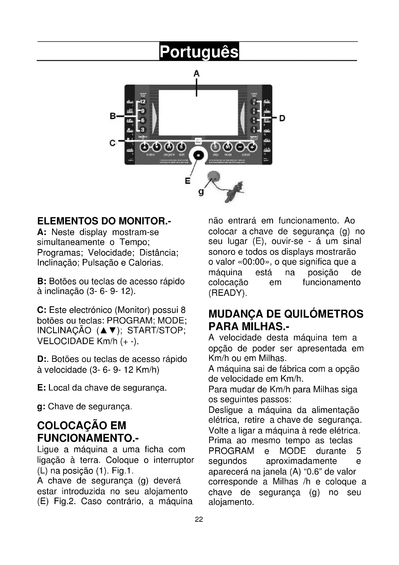 Deslgue a boaina da alimentacao eletrica, retire a chave de seguranga. Volte a ligar a boaina a rede eletrica. Prima ao mesmo tempo as teclas PROGRAM e MODE durante 5 segculos aproximamente e aparecerá na janela (A) "0.6" de valor corresponde a Milhas /h e coloque a chave de seguranga (g) no seu alojamento.