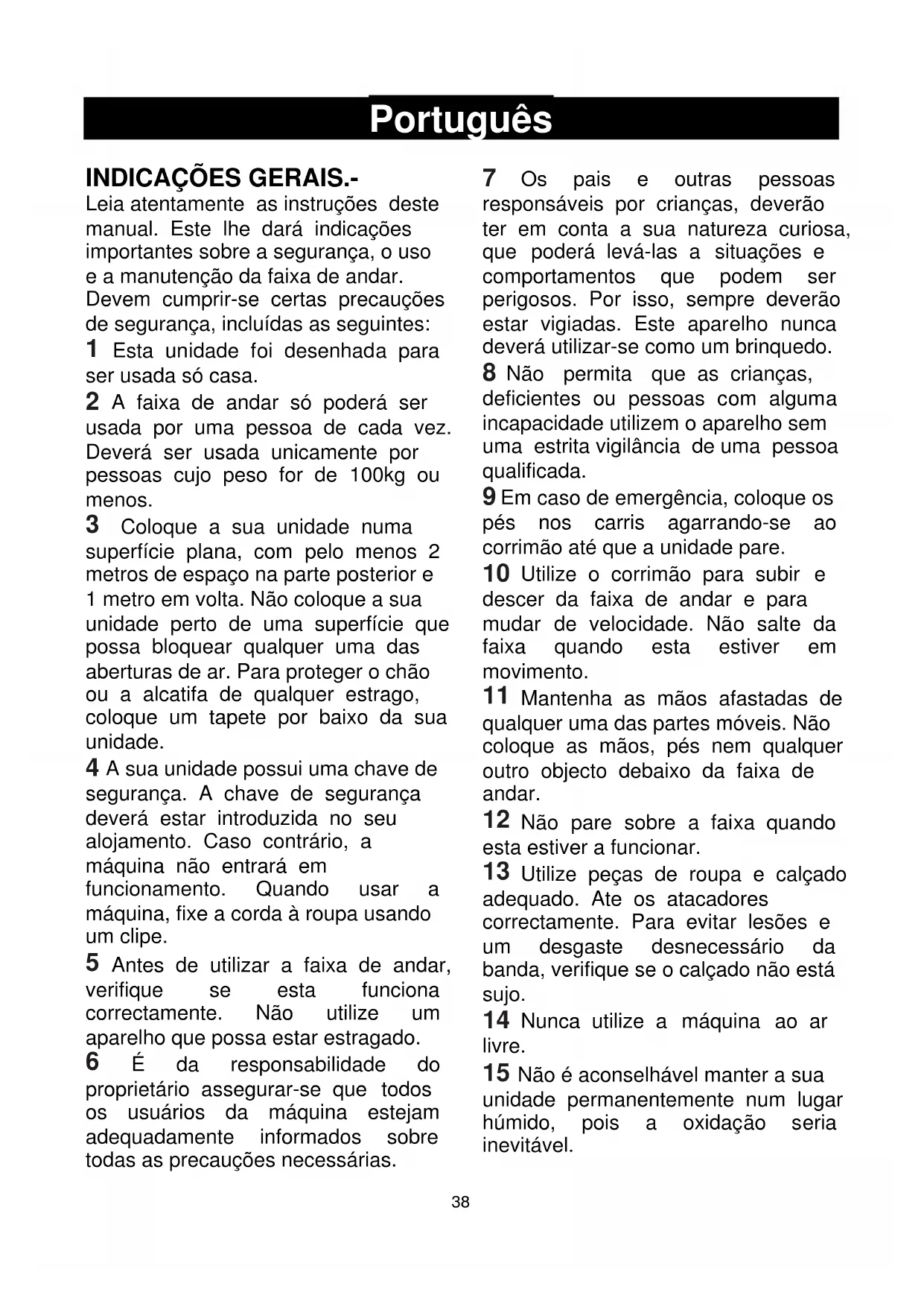 Leia atentamente as instruções deste manual. Este lhe está indentados importantes sobre a segurar, o uso e a manutenção da faixa de andar. Devem cumprir-seisas precauções de segurar, incluidas as seguiças: