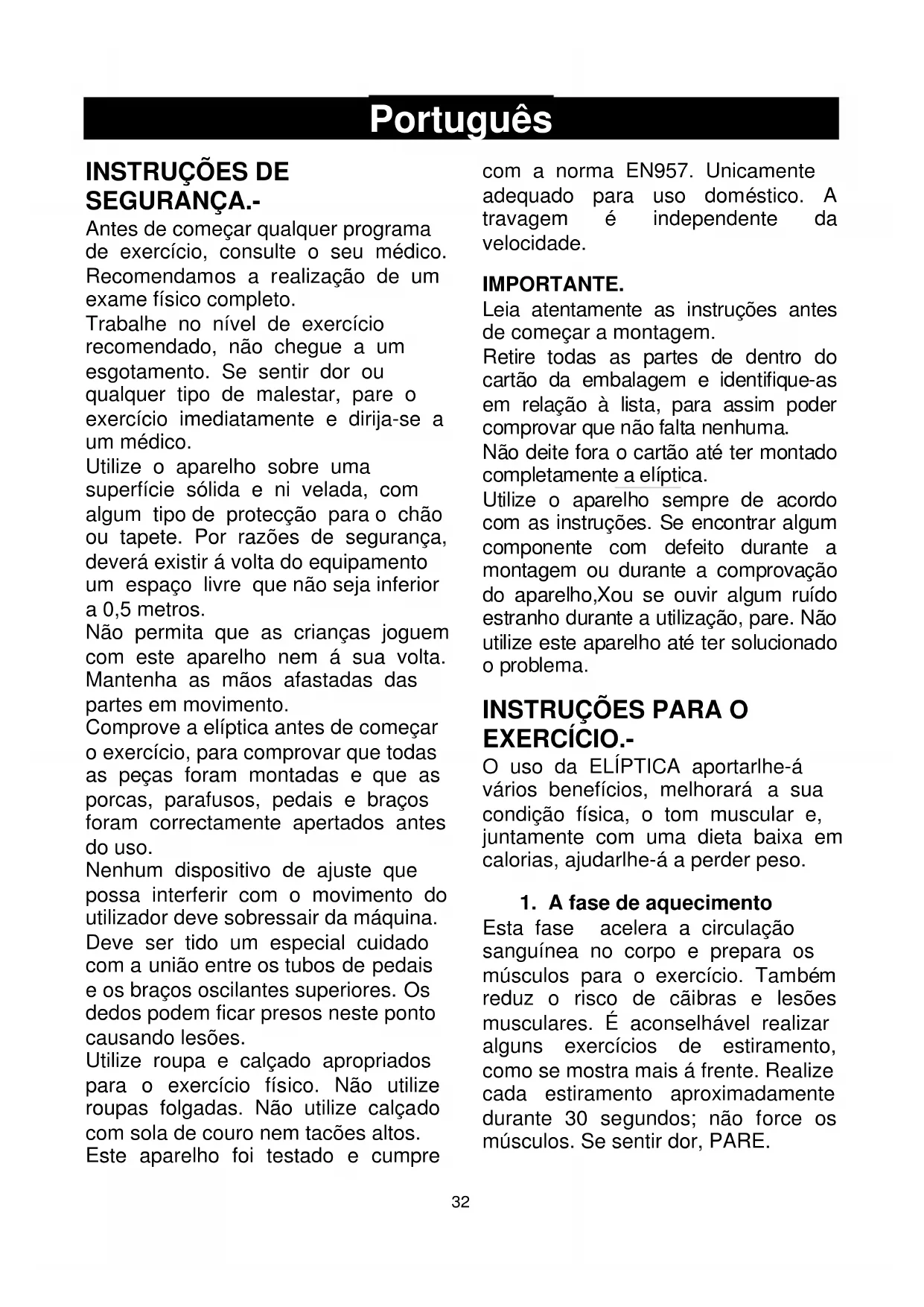 Comprove a eliptica antes devenir o exercicio, para comprovar que todas as peças foram montadas e que as porcas, parafusos, pedais e braços foram correctamente apertados antes do uso.