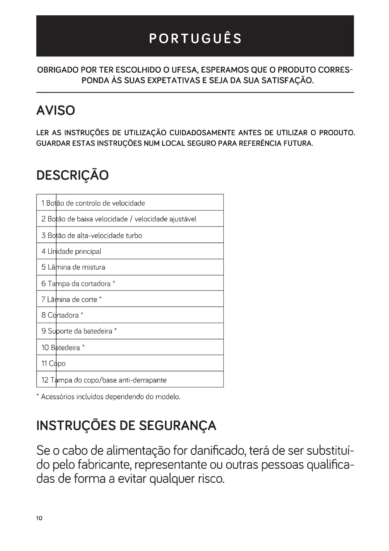 Este produto está em conformidade com a Diretiva Europeia 2012/19/EU quanto a dispo- sitivos elétricos e eletrónicos, conhecida como REEE (Resíduos de Equipamentos Elétricos e Eletrónicos), que disponibiliza o enquadramento legal dentro da União Europeia para a eliminação e reutilização de resíduos eletrónicos e elétricos. Não eliminar este produto no caixote do lixo. Dirigir-se antes ao centro de recolha de resíduos elétricos e eletrónicos da área de residência.15 WE WOULD LIKE TO THANKS YOU FOR CHOOSING UFESA, WE WISH THE PRODUCT PERFORMS TO YOUR SATISFACTION AND PLEASURE. WARNING PLEASE READ THE INSTRUCTIONS FOR USE CAREFULLY PRIOR TO USING THE PRODUCT. STORE THESE IN A SAFE PLACE FOR FUTURE REFERENCE. DESCRIPTION 1 Speed control knob 2 Low speed button / speed adjustable 3 Turbo high speed button 4 Main unit 5 Blending blade 6 Chopper lid * 7 Chopping blade * 8 Chopper * 9 Whisk support * 10 Whisk * 11 Beaker 12 Beaker cover/anti slip base