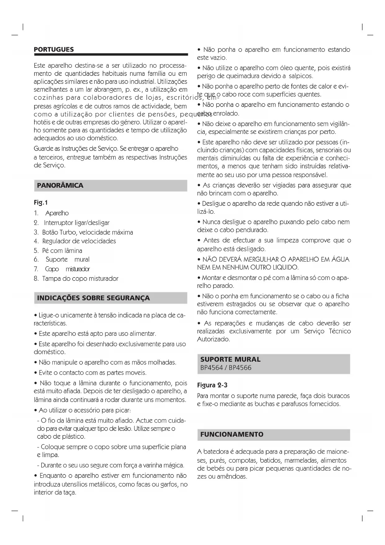 - As reparações e mudanças de cabo deverão ser realizadas exclusivamente por um Serviço Técnico Autorizado. SUPORTE MURAL BP4564 / BP4566 Figura 2-3 Para montar o suporte numa parede, faça dois buracos e fixe-o mediante as buchas e parafusos fornecidos. FUNCIONAMENTO A batedora é adequada para a preparação de maione- ses, purés, compotas, batidos, marmeladas, alimentos de bebés ou para picar pequenas quantidades de no- zes ou amêndoas.Advertência: A batedora não é apropriada para prepa- rar puré de batatas.