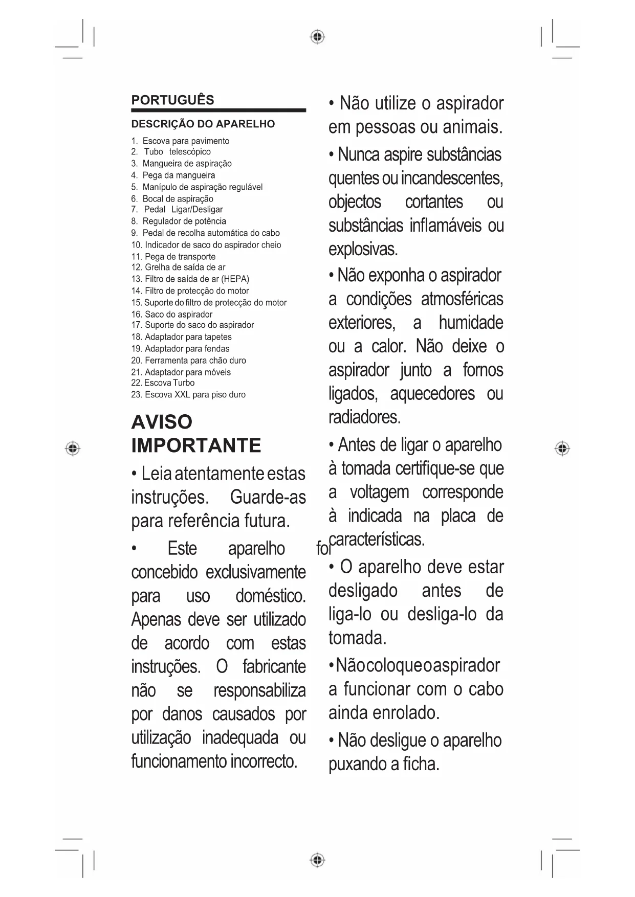 - Não pegue no aspirador ou na ficha com as mãos molhadas. Não mergulhe o aparelho na água.