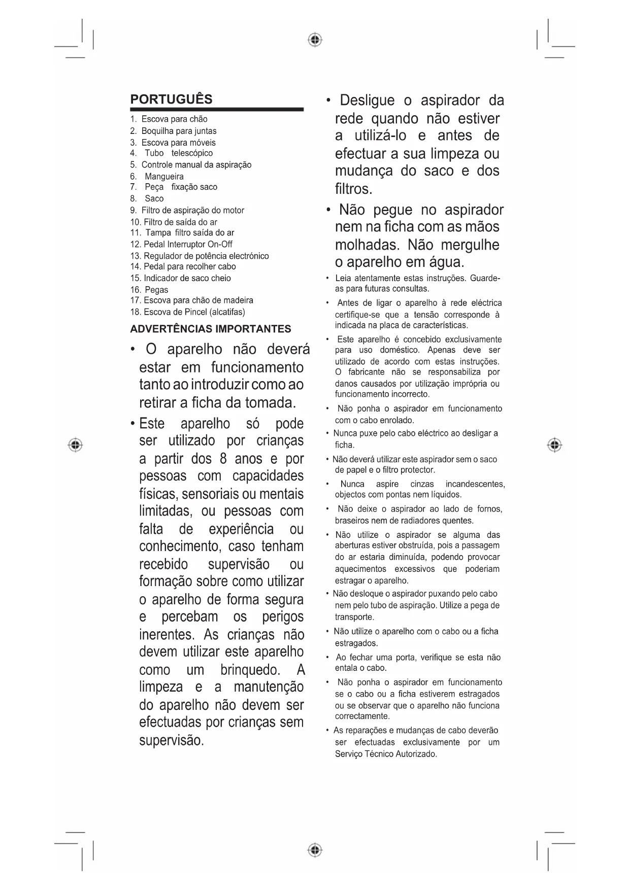 - Não ponha o aspirador em funcionamento se o cabo ou a ficha estiverem estragados ou se observar que o aparelho não funciona correctamente.