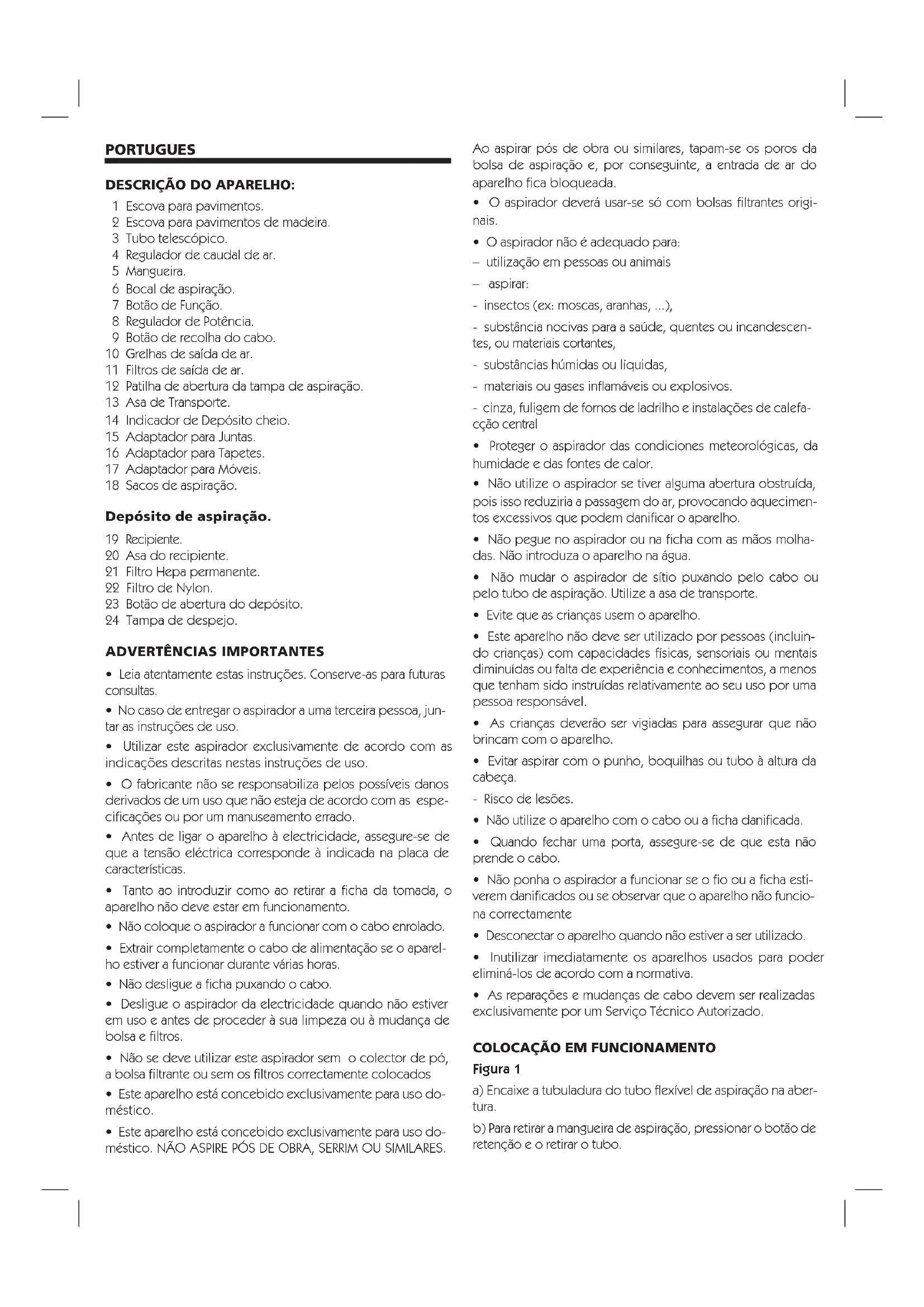 - Este aparelho está concebido exclusivamente para uso do- méstico. NÃO ASPIRE PÓS DE OBRA, SERRIM OU SIMILARES. Ao aspirar pós de obra ou similares, tapam-se os poros da bolsa de aspiração e, por conseguinte, a entrada de ar do aparelho fica bloqueada.