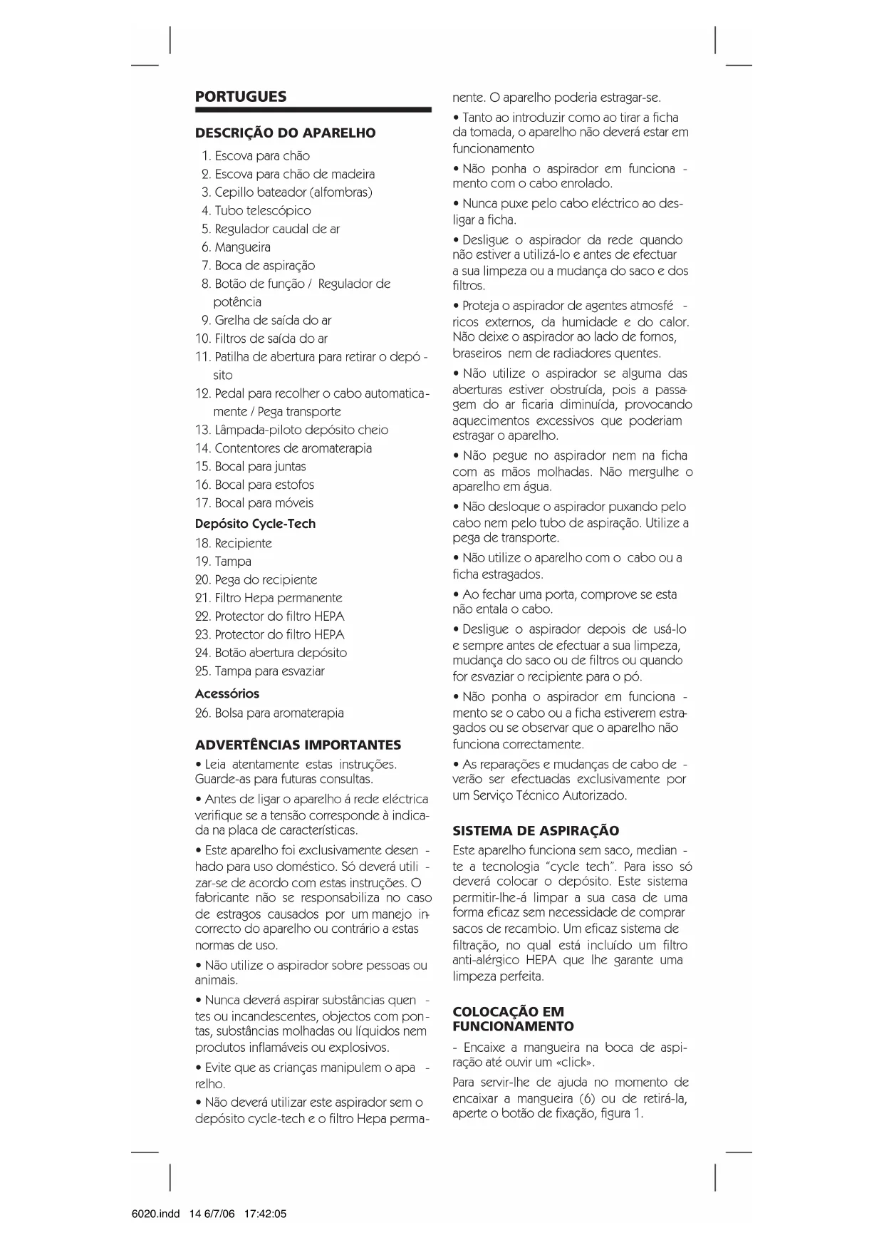 - Não deverá utilizar este aspirador sem o depósito cycle-tech e o filtro Hepa perma