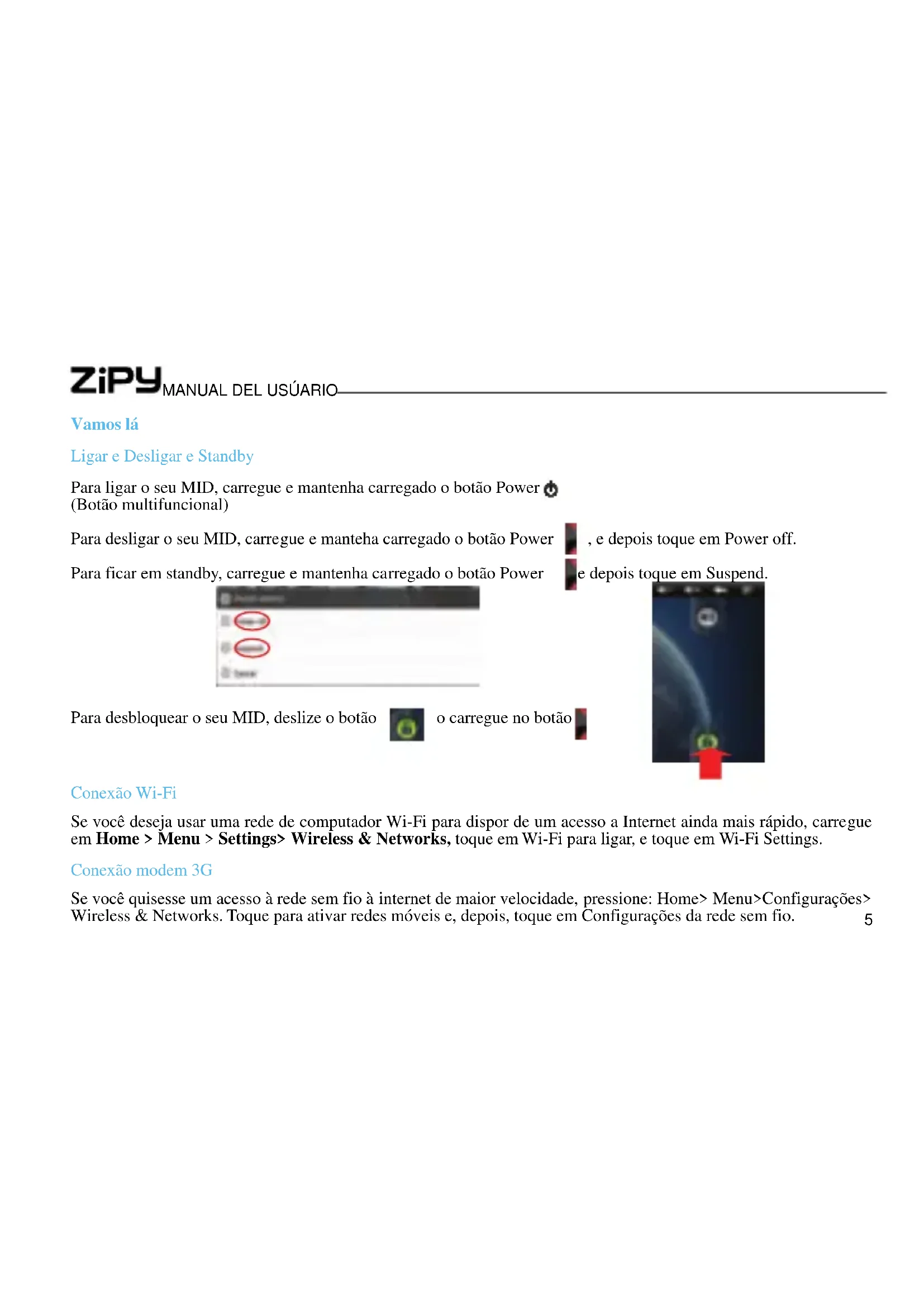 Para desbloquear o seu MID, deslize o botão o carregue no botão Conexão Wi-Fi Se você deseja usar uma rede de computador Wi-Fi para dispor de um acesso a Internet ainda mais rápido, carregue em Home > Menu > Settings> Wireless & Networks, toque em Wi-Fi para ligar, e toque em Wi-Fi Settings. Conexão modem 3G Se você quisesse um acesso à rede sem fio à internet de maior velocidade, pressione: Home> Menu>Configurações> Wireless & Networks. Toque para ativar redes móveis e, depois, toque em Configurações da rede sem fio.ZIPY FUN FRENDS