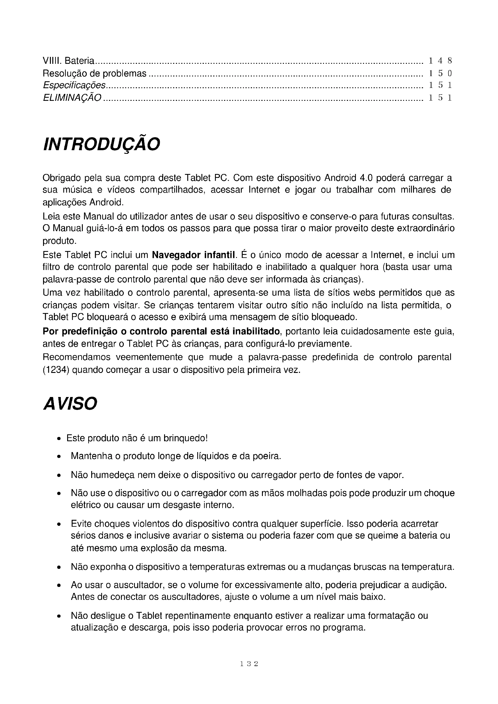 VIIII. Bateria ........................................................................................................................... 148 Resolução de problemas ....................................................................................................... 150 Especificações ....................................................................................................................... 151 ELIMINAÇÃO ........................................................................................................................ 151 INTRODUÇÃO Obrigado pela sua compra deste Tablet PC. Com este dispositivo Android 4.0 poderá carregar a sua música e vídeos compartilhados, acessar Internet e jogar ou trabalhar com milhares de aplicações Android. Leia este Manual do utilizador antes de usar o seu dispositivo e conserve-o para futuras consultas. O Manual guiá-lo-á em todos os passos para que possa tirar o maior proveito deste extraordinário produto. Este Tablet PC inclui um Navegador infantil. É o único modo de acessar a Internet, e inclui um filtro de controlo parental que pode ser habilitado e inabilitado a qualquer hora (basta usar uma palavra-passe de controlo parental que não deve ser informada às crianças). Uma vez habilitado o controlo parental, apresenta-se uma lista de sítios webs permitidos que as crianças podem visitar. Se crianças tentarem visitar outro sítio não incluído na lista permitida, o Tablet PC bloqueará o acesso e exibirá uma mensagem de sítio bloqueado. Por predefinição o controlo parental está inabilitado, portanto leia cuidadosamente este guia, antes de entregar o Tablet PC às crianças, para configurá-lo previamente. Recomendamos veementemente que mude a palavra-passe predefinida de controlo parental (1234) quando começar a usar o dispositivo pela primeira vez. AVISO