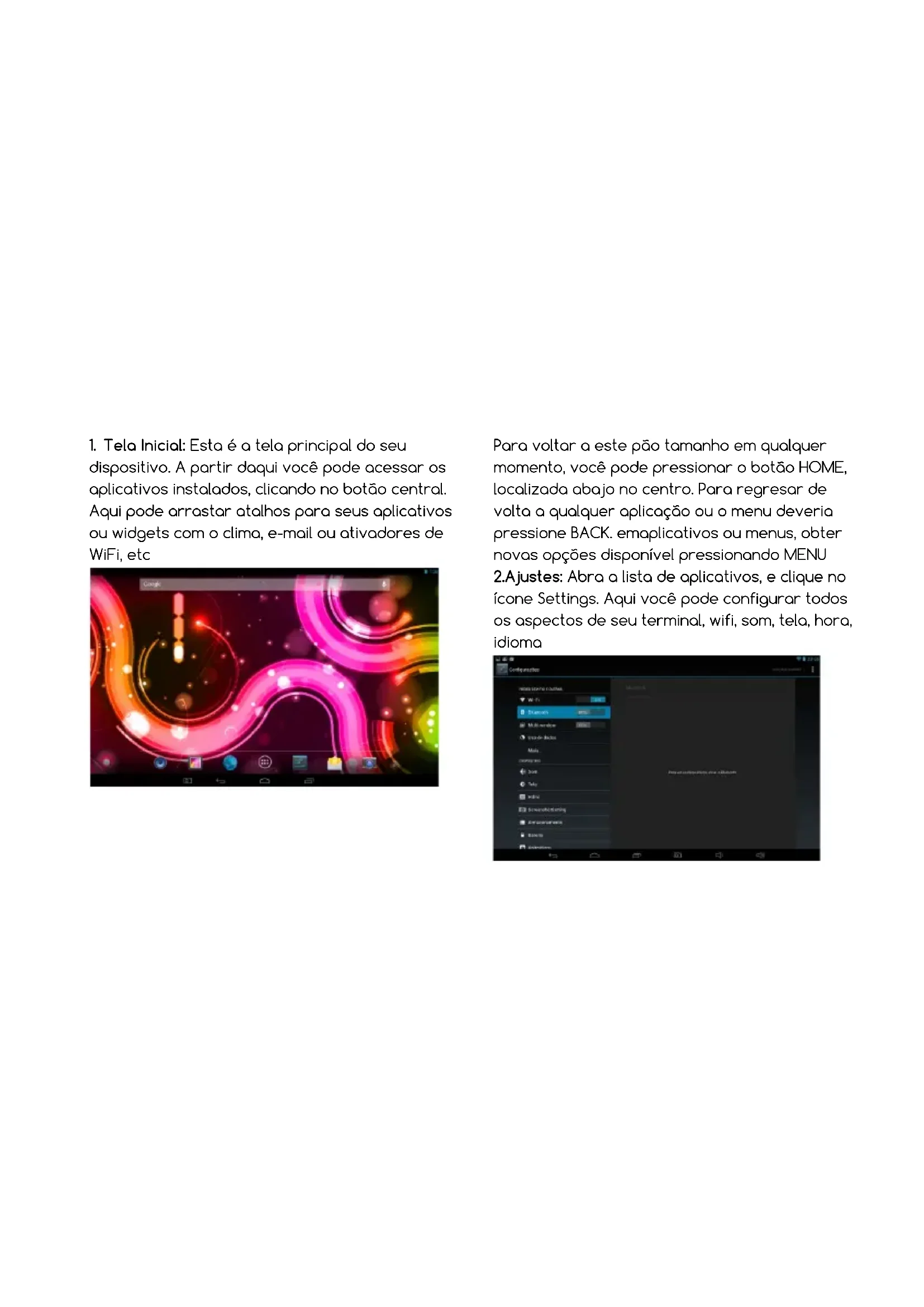 Para voltar a este pão tamanho em qualquer momento, você pode pressionar o botão HOME, localizada abajo no centro. Para regresar de volta a qualquer aplicação ou o menu deveria pressione BACK. emaplicativos ou menus, obter novas opções disponível pressionando MENU 2.Ajustes: Abra a lista de aplicativos, e clique no ícone Settings. Aqui você pode configurar todos os aspectos de seu terminal, wifi, som, tela, hora, idiomaPara se conectar a uma rede sem fio, toque na secção wifi, eo ativando o canto. As disposições redes sem fio vas encontrar o seu alcance, podendo estabelecer co- conexão com ela.. Você pode ativar o Wi-Fi exibindo a barra superior notificações dedo para baixo Não tem controles rápidos para alternar wifi. 3.Aplicaciones: Para instalar os aplicativos precisam associar uma conta do Gmail com o seu dispositivo para download a partir do Google Play. Os aplicativos são instalados na memória do telefone, sendo este um espaço limitado. Elimine aplicativos desnecessários para economizar espaço Note que você pode encontrar aplicações gratuitas e pagas, as definições também precisade um método de pagamento para compras