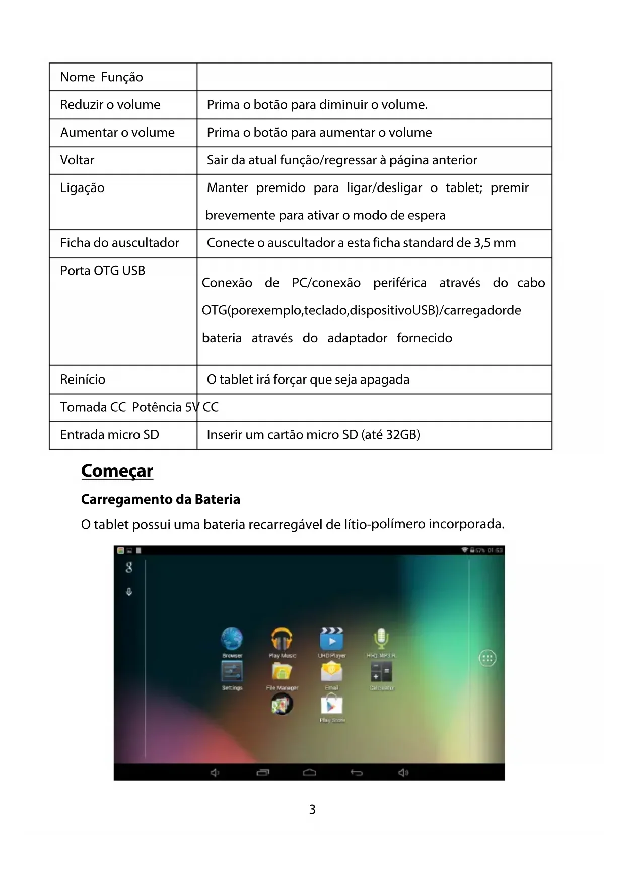 | Entrada micro SD | Inserir um cartão micro SD (até 32GB) |