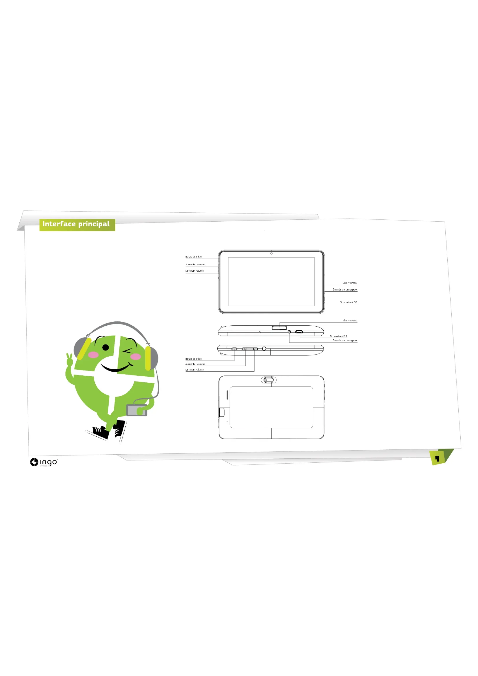Conteudo da embalagem:4 Interface principal Botão de início Botão de início Aumentar volume Aumentar volume Diminuir volume Diminuir volume Entrada do carregador Entrada do carregador Slot microSD Slot microSD Ficha microUSB Ficha microUSB5 Carga O seu tablet só pode ser carregado com o adaptador de energia fornecido. Ligue o adaptador na tomada de energia e o conector do cabo do adaptador na entrada do Tablet. Ecrã principal Estes são os principais ícones que aparecem no ecrã principal do seu Tablet Ingo: