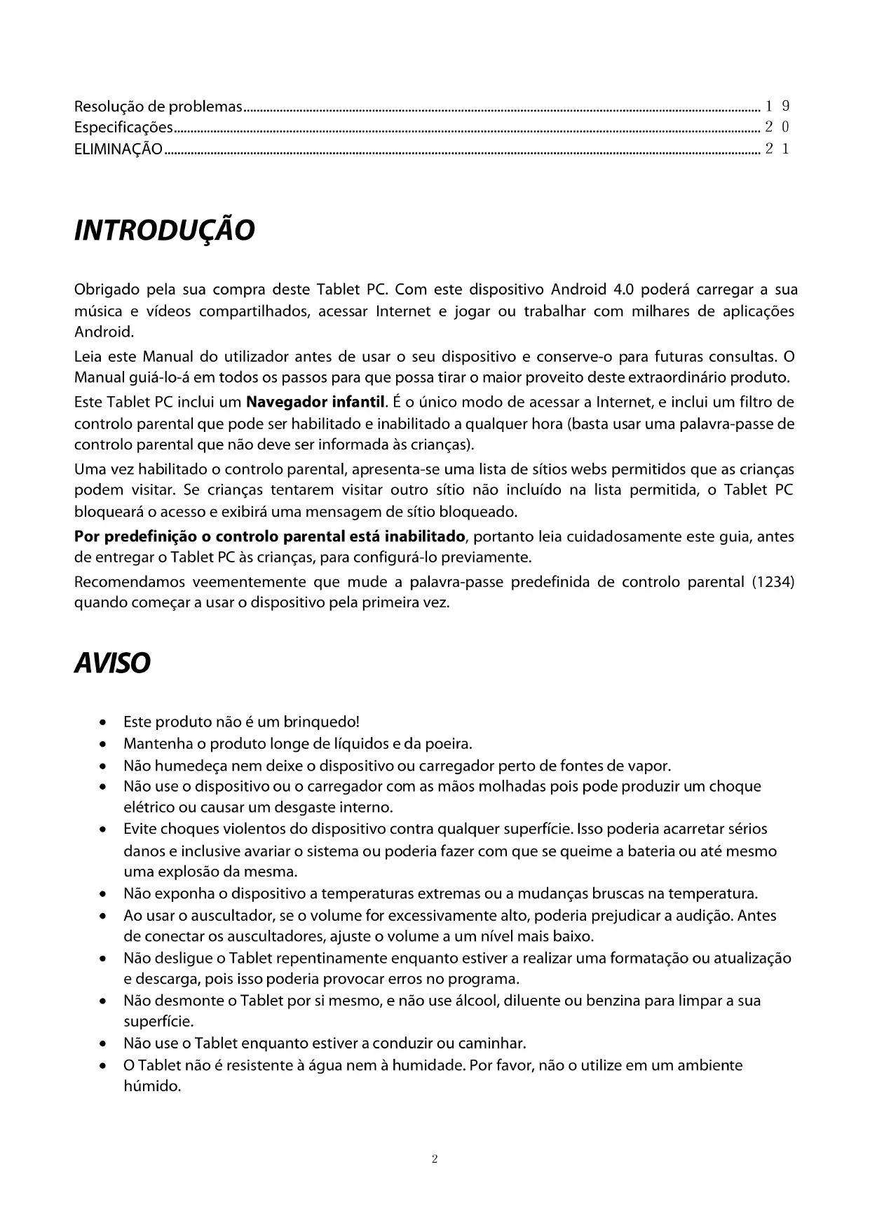 Resolução de problemas ............................................................................................................................................................. 19 Especificações .................................................................................................................................................................................. 20 ELIMINAÇÃO ..................................................................................................................................................................................... 21 INTRODUÇÃO Obrigado pela sua compra deste Tablet PC. Com este dispositivo Android 4.0 poderá carregar a sua música e vídeos compartilhados, acessar Internet e jogar ou trabalhar com milhares de aplicações Android. Leia este Manual do utilizador antes de usar o seu dispositivo e conserve-o para futuras consultas. O Manual guiá-lo-á em todos os passos para que possa tirar o maior proveito deste extraordinário produto. Este Tablet PC inclui um Navegador infantil. É o único modo de acessar a Internet, e inclui um filtro de controlo parental que pode ser habilitado e inabilitado a qualquer hora (basta usar uma palavra-passe de controlo parental que não deve ser informada às crianças). Uma vez habilitado o controlo parental, apresenta-se uma lista de sítios webs permitidos que as crianças podem visitar. Se crianças tentarem visitar outro sítio não incluído na lista permitida, o Tablet PC bloqueará o acesso e exibirá uma mensagem de sítio bloqueado. Por predefinição o controlo parental está inabilitado, portanto leia cuidadosamente este guia, antes de entregar o Tablet PC às crianças, para configurá-lo previamente. Recomendamos veementemente que mude a palavra-passe predefinida de controlo parental (1234) quando começar a usar o dispositivo pela primeira vez. AVISO