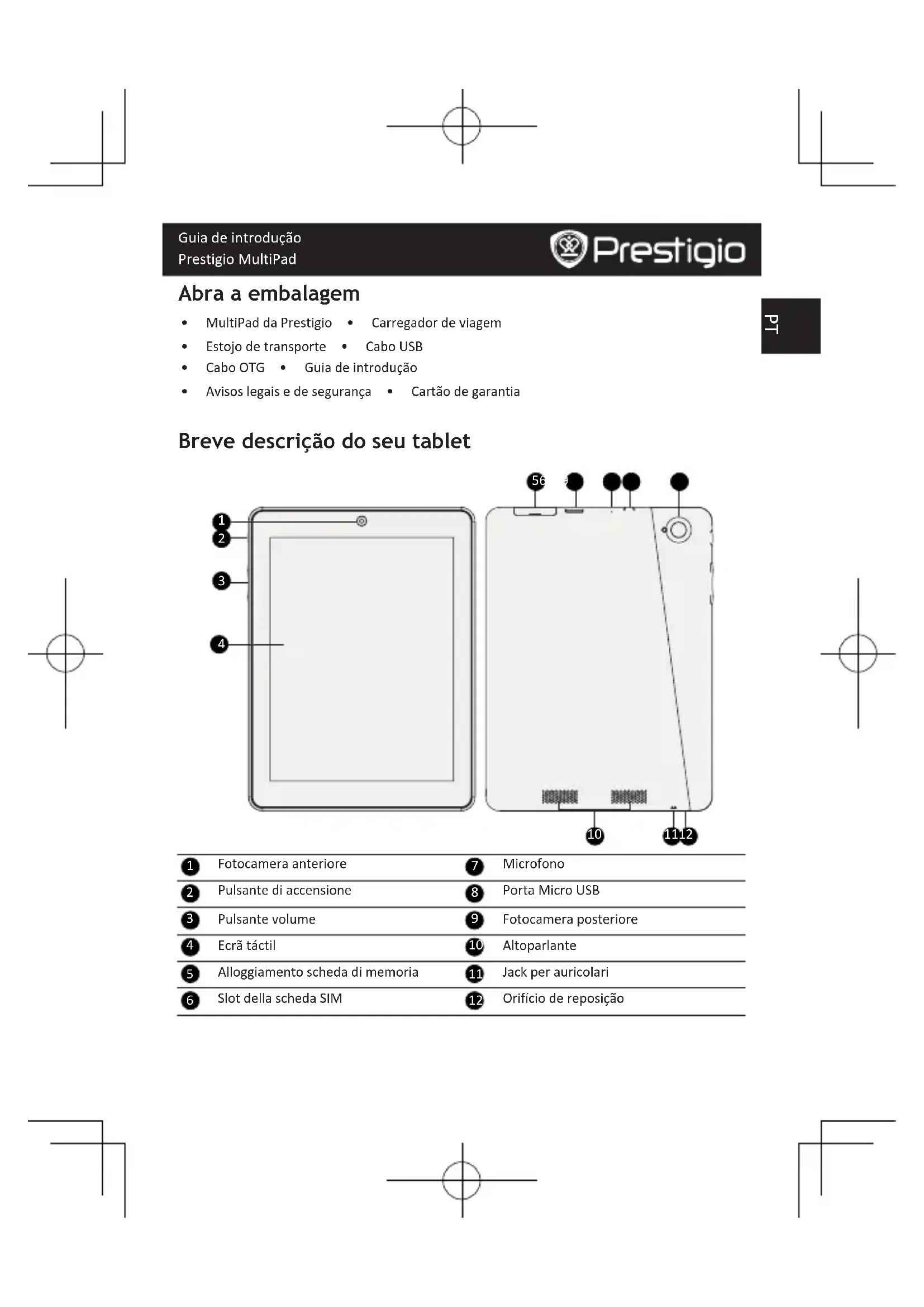 - Toqueparaabriralistadeaplicaçõesrecentes. Menudelistas • Toqueparaabriromenudelistas. Introdução 1.Insiraumcartãodememória. 2.InsiraocartãoSIM. (UtilizarapenasocartãoSIMpadrão) 3.Primaemantenhapremidaatecladealimentaçãoparaligarotablet. Carregar o tablet LigueotabletaumatomadaeléctricautilizandoocaboUSBeocarregadordeviagemincluídos.PT Guia de introdução Prestigio MultiPad Effettuare una chiamata Utilizzareunodeiseguentimetodi: