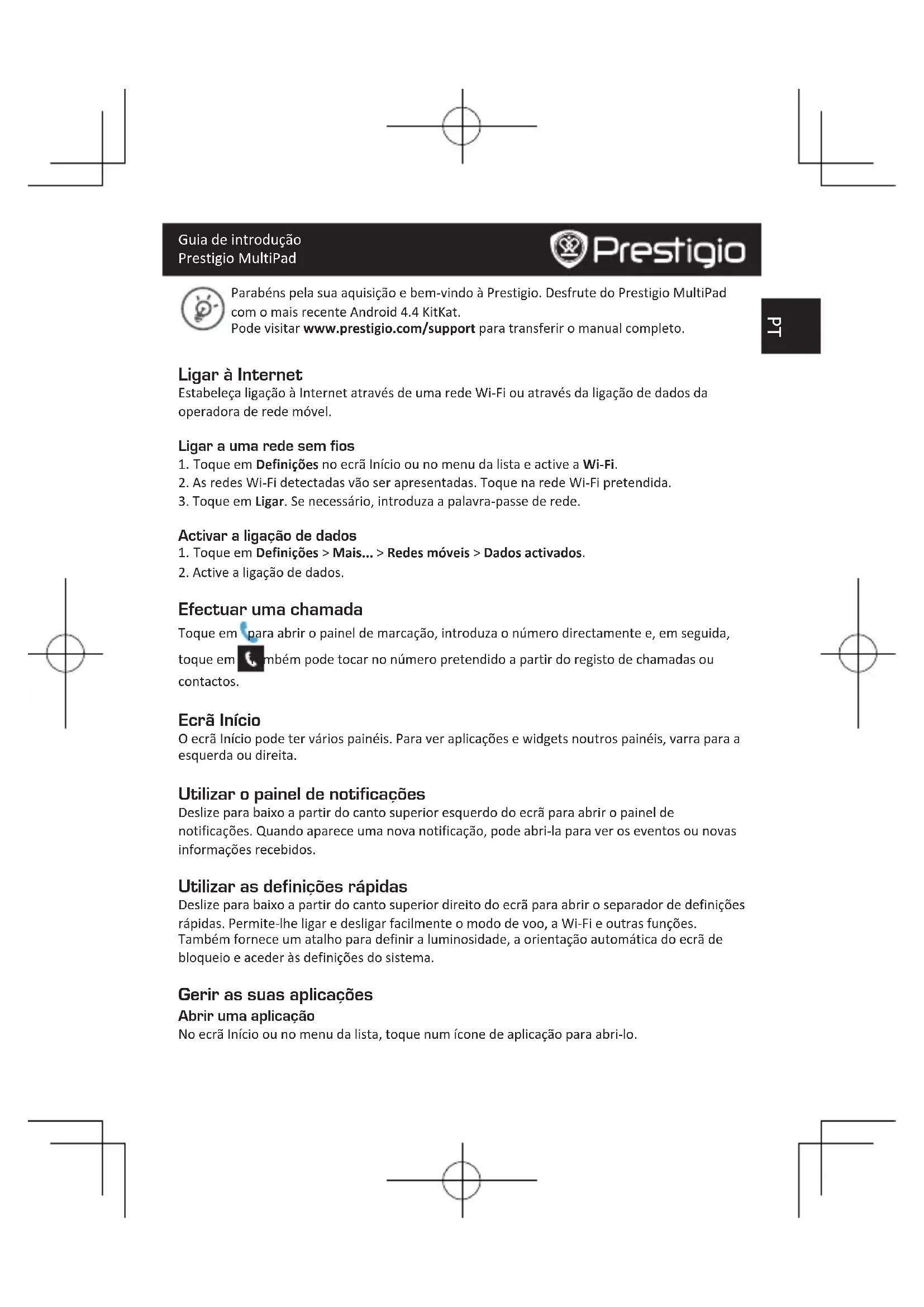 Efectuar uma chamada Toque em para abrir o painel de marcação, introduza o número directamente e, em seguida, toque em . Também pode tocar no número pretendido a partir do registo de chamadas ou contactos. Ecrã Início O ecrã Início pode ter vários painéis. Para ver aplicações e widgets noutros painéis, varra para a esquerda ou direita. Utilizar o painel de notificações Deslize para baixo a partir do canto superior esquerdo do ecrã para abrir o painel de notificações. Quando aparece uma nova notificação, pode abri-la para ver os eventos ou novas informações recebidos. Utilizar as definições rápidas Deslize para baixo a partir do canto superior direito do ecrã para abrir o separador de definições rápidas. Permite-lhe ligar e desligar facilmente o modo de voo, a Wi-Fi e outras funções. Também fornece um atalho para definir a luminosidade, a orientação automática do ecrã de bloqueio e aceder às definições do sistema. Gerir as suas aplicações Abrir uma aplicação No ecrã Início ou no menu da lista, toque num ícone de aplicação para abri-lo.PT Guia de introdução Prestigio MultiPad Adicionar um ícone de aplicação ao ecrã Início No menu da lista, toque e mantenha premida a aplicação e arraste-a para o local adequado no ecrã Início. Remover uma aplicação Toque e mantenha premida a aplicação, arraste-a para o ícone de remoção na parte superior e liberte-a depois do ícone aparecer a vermelho. Criar uma pasta Combine vários ícones de aplicação em conjunto arrastando uma aplicação para cima de outra. Uma vez que os produtos da Prestigio estão sempre a ser melhorados e actualizados, o software e o hardware do seu dispositivo podem ter um aspecto ou um funcionamento ligeiramente diferentes dos apresentados no Guia de introdução. A Prestigio informa que este Multipad está em conformidade com os requisitos básicos e outras regulamentações relevantes indicadas na directiva UE 1999/5/CE. A versão completa da declaração de conformidade está disponível em: www.prestigio.com/certificates. Para evitar possíveis danos auditivos, não ouça a níveis de volume elevados durante períodos prolongados. Para obter as informações de SAR (taxa de absorção específica), vá para: www.prestigio.com/catalogue/MultiPads/MultiPad_Muze_5001_3GRO Scurt ghid de utilizare Prestigio MultiPad Felicitari pentru achizitie si bine ati venit la Prestigio. Bucurati-va de Prestigio MultiPad cu cea mai noua varianta de Android 4.4 KitKat. Puteti vizita www.prestigio.com/support pentru a descarca versiunea completa a manualului. Conectare la Internet Conectati-va la Internet prin reteaua Wi-Fi sau prin intermediul operatorului mobil. Conectare la reteaua wireless