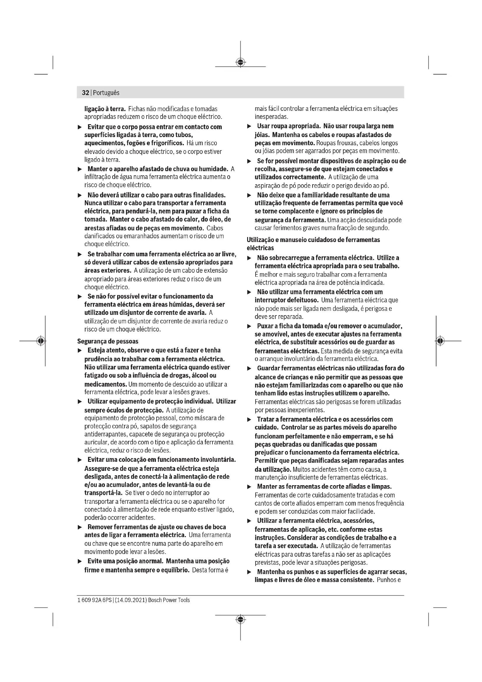 M6 2.71 3.61 4.52 4.8 5.42 6.02 7.22 8.13 9.7 13.6 16.2 M8 6.57 8.7 11 11.6 13.1 14.6 17.5 19.7 23 33 39 M10 13 17.5 22 23 26 29 35 39 47 65 78 M12 22.6 30 37.6 40 45 50 60 67 80 113 135 M14 36 48 60 65 72 79 95 107 130 180 215 M16 55 73 92 98 110 122 147 165 196 275 330 Consejos prácticos Antes de enroscar tornillos grandes y largos en materiales duros deberá taladrarse un agujero con el diámetro del nú- cleo de la rosca a una profundidad aprox. correspondiente a 2/3 de la longitud del tornillo. Indicación: Preste atención a que no penetren piezas pe- queñas metálicas en la herramienta eléctrica. Indicaciones para el trato óptimo del acumulador Proteja el acumulador ante humedad y agua. Únicamente almacene el acumulador en el margen de tem- peratura desde –20 °C hasta 50 °C. P. ej., no deje el acumu- lador en el coche en verano. Si después de una recarga, el tiempo de funcionamiento del acumulador fuese muy reducido, ello es señal de que éste está agotado y deberá sustituirse. Observe las indicaciones referentes a la eliminación. Limpie de vez en cuando las rejillas de refrigeración y los co- nectores de la batería con un pincel suave, limpio y seco. Clip de cinturón (ver figura E) El clip de cinturón (17) le permite enganchar la herramienta eléctrica, p.ej., a un cinturón. De esta manera le quedan li- bres ambas manos y tiene siempre accesible la herramienta eléctrica. Clip de color (ver figura F) Con el clip de color (18) puede marcar individualmente la herramienta eléctrica. Mantenimiento y servicio Mantenimiento y limpieza u Limpie el portaútiles (1) y el casquillo de enclavamien- to (2) de vez en cuando. u Limpie regularmente las ranuras de ventilación de su herramienta eléctrica. El ventilador del motor aspira polvo hacia el interior de la carcasa, por lo que, en caso de una acumulación fuerte de polvo metálico, ello puede provocarle una descarga eléctrica. u Desmonte el acumulador antes de manipular la herra- mienta eléctrica (p. ej. en el mantenimiento, cambio de útil, etc.) así como al transportarla y guardarla. En caso contrario podría accidentarse al accionar fortuita- mente el interruptor de conexión/desconexión. u Mantenga limpia la herramienta eléctrica y las rejillas de refrigeración para trabajar con eficacia y seguri- dad. 1 609 92A 6PS | (14.09.2021) Bosch Power ToolsPortuguês | 31 Servicio técnico y atención al cliente El servicio técnico le asesorará en las consultas que pueda Ud. tener sobre la reparación y mantenimiento de su produc- to, así como sobre piezas de recambio. Las representacio- nes gráficas tridimensionales e informaciones de repuestos se encuentran también bajo: www.bosch-pt.com El equipo asesor de aplicaciones de Bosch le ayuda gustosa- mente en caso de preguntas sobre nuestros productos y sus accesorios. Para cualquier consulta o pedido de piezas de repuesto es imprescindible indicar el nº de artículo de 10dígitos que fi- gura en la placa de características del producto. España Robert Bosch España S.L.U. Departamento de ventas Herramientas Eléctricas C/Hermanos García Noblejas, 19 28037 Madrid Para efectuar su pedido online de recambios o pedir la reco- gida para la reparación de su máquina, entre en la página www.herramientasbosch.net. Tel. Asesoramiento al cliente: 902 531 553 Fax: 902 531554 Direcciones de servicio adicionales se encuentran bajo: www.bosch-pt.com/serviceaddresses Transporte Los acumuladores de iones de litio incorporados están suje- tos a los requerimientos estipulados en la legislación sobre mercancías peligrosas. Los acumuladores pueden ser trans- portados por carretera por el usuario sin más imposiciones. En el envío por terceros (p.ej., transporte aéreo o por agen- cia de transportes) deberán considerarse las exigencias es- peciales en cuanto a su embalaje e identificación. En este ca- so deberá recurrirse a los servicios de un experto en mercan- cías peligrosas al preparar la pieza para su envío. Únicamente envíe acumuladores si su carcasa no está daña- da. Si los contactos no van protegidos cúbralos con cinta adhesiva y embale el acumulador de manera que éste no se pueda mover dentro del embalaje. Observe también las prescripciones adicionales que pudieran existir al respecto en su país. Eliminación Las herramientas eléctricas, acumuladores, ac- cesorios y embalajes deberán someterse a un proceso de recuperación que respete el medio ambiente. ¡No arroje las herramientas eléctricas, acumu- ladores o pilas a la basura! Sólo para los países de laUE: Las herramientas eléctricas inservibles, así como los acumu- ladores/pilas defectuosos o agotados deberán coleccionarse por separado para ser sometidos a un reciclaje ecológico se- gún las Directivas Europeas 2012/19/UE y 2006/66/CE, respectivamente. Acumuladores/pilas: Iones de Litio: Por favor, observe las indicaciones en el apartado Transpor- te (ver "Transporte", Página31). El símbolo es solamente válido, si también se encuentra sobre la placa de características del producto/fabricado. Português Instruções de segurança Instruções gerais de segurança para ferramentas eléctricas AVISO Devem ser lidas todas as indicações de segurança, instruções, ilustrações e especificações desta ferramenta eléctrica. O desrespeito das instruções apresentadas abaixo poderá resultar em choque eléctrico, incêndio e/ou ferimentos graves. Guarde bem todas as advertências e instruções para futura referência. O termo "ferramenta eléctrica" utilizado a seguir nas indicações de advertência, refere‑se a ferramentas eléctricas operadas com corrente de rede (com cabo de rede) e a ferramentas eléctricas operadas com acumulador (sem cabo de rede). Segurança da área de trabalho u Mantenha a sua área de trabalho sempre limpa e bem iluminada. Desordem ou áreas de trabalho insuficientemente iluminadas podem levar a acidentes. u Não trabalhar com a ferramenta eléctrica em ár