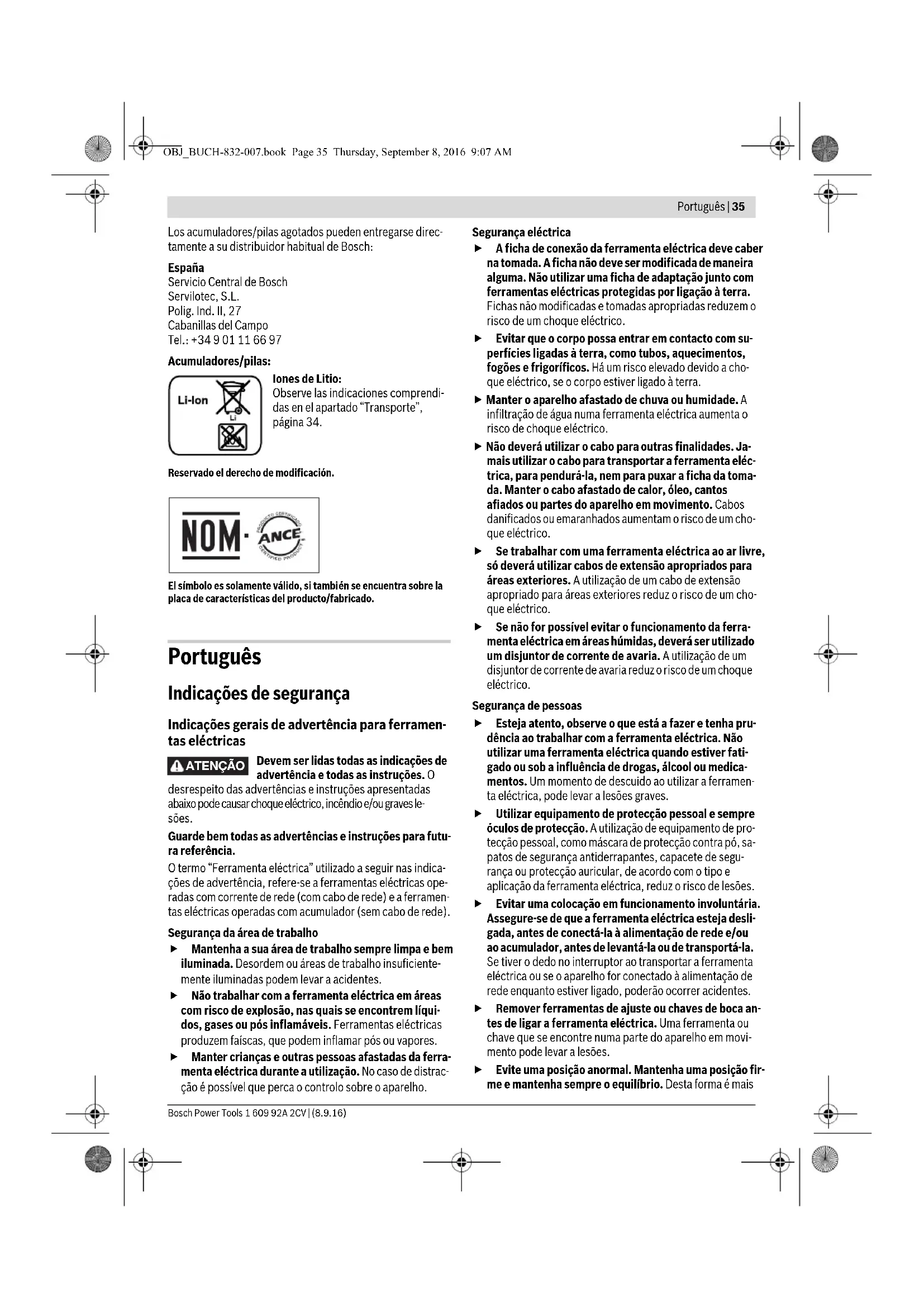 OBJ_BUCH-832-007.book Page 33 Thursday, September 8, 2016 9:07 AM34 | Español 1 609 92A 2CV | (8.9.16) Bosch Power Tools Mantenimiento y servicio Mantenimiento y limpieza Desmonte el acumulador antes de manipular en la he- rramienta eléctrica (p.ej. en el mantenimiento, cambio de útil, etc.), así como al transportarla y guardarla. En caso contrario podría accidentarse al accionar fortuita- mente el interruptor de conexión/desconexión. Mantenga limpia la herramienta eléctrica y las rejillas de refrigeración para trabajar con eficacia y seguridad. Cambio de escobillas (ver figura E) Verifique la longitud de las escobillas cada 2–3 meses, aprox., y sustitúyalas si procede. ¡Jamás sustituya solamente una escobilla! Observación: Únicamente emplee unas escobillas adquiri- das a través de Bosch para este producto. – Afloje las tapas 16 con un destornillador adecuado. – Sustituya las escobillas 15 sometidas a la presión de un re- sorte, y vuelva montar las tapas. Servicio técnico y atención al cliente El servicio técnico le asesorará en las consultas que pueda Ud. tener sobre la reparación y mantenimiento de su produc- to, así como sobre piezas de recambio. Los dibujos de despie- ce e informaciones sobre las piezas de recambio los podrá ob- tener también en internet bajo: www.bosch-pt.com Nuestro equipo de asesores técnicos le orientará gustosa- mente en cuanto a la adquisición, aplicación y ajuste de los productos y accesorios. Para cualquier consulta o pedido de piezas de repuesto es im- prescindible indicar el nº de artículo de 10 dígitos que figura en la placa de características de la herramienta eléctrica. España Robert Bosch Espana S.L.U. Departamento de ventas Herramientas Eléctricas C/Hermanos García Noblejas, 19 28037 Madrid Para efectuar su pedido online de recambios o pedir la recogi- da para la reparación de su máquina, entre en la página www.herramientasbosch.net. Tel. Asesoramiento al cliente: 902 531 553 Fax: 902 531554 Venezuela Robert Bosch S.A. Final Calle Vargas. Edf. Centro Berimer P.B. Boleita Norte Caracas 107 Tel.: (0212) 2074511 México Robert Bosch S. de R.L. de C.V. Calle Robert Bosch No. 405 C.P. 50071 Zona Industrial, Toluca - Estado de México Tel. Interior: (01) 800 6271286 Tel. D.F.: 52843062 E-Mail: arturo.fernandez@mx.bosch.com Argentina Robert Bosch Argentina S.A. Av. Córdoba 5160 C1414BAW Ciudad Autónoma de Buenos Aires Atención al Cliente Tel.: (0810) 5552020 E-Mail: herramientas.bosch@ar.bosch.com Perú Robert Bosch S.A.C. Av. Primavera 781, Urb. Chacarilla, San Borja (Edificio Aldo) Buzón Postal Lima 41 - Lima Tel.: (01) 2190332 Chile Robert Bosch S.A. Calle El Cacique 0258 Providencia – Santiago Tel.: (02) 2405 5500 Transporte Los acumuladores de iones de litio incorporados están suje- tos a los requerimientos estipulados en la legislación sobre mercancías peligrosas. Los acumuladores pueden ser trans- portados por carretera por el usuario sin más imposiciones. En el envío por terceros (p. ej., transporte aéreo o por agencia de transportes) deberán considerarse las exigencias especia- les en cuanto a su embalaje e identificación. En este caso de- berá recurrirse a los servicios de un experto en mercancías peligrosas al preparar la pieza para su envío. Únicamente envíe acumuladores si su carcasa no está daña- da. Si los contactos no van protegidos cúbralos con cinta ad- hesiva y embale el acumulador de manera que éste no se pue- da mover dentro del embalaje. Observe también las prescripciones adicionales que pudieran existir al respecto en su país. Eliminación Las herramientas eléctricas, acumuladores, acceso- rios y embalajes deberán someterse a un proceso de recuperación que respete el medio ambiente. ¡No arroje las herramientas eléctricas, acumuladores o pilas a la basura! Sólo para los países de la UE: Las herramientas eléctricas inservibles, así como los acumuladores/pilas defectuosos o agotados deberán acumularse por sepa- rado para ser sometidos a un reciclaje eco- lógico tal como lo marcan las Directivas Europeas 2012/19/UE y 2006/66/CE, respectivamente. OBJ_BUCH-832-007.book Page 34 Thursday, September 8, 2016 9:07 AMPortuguês | 35 Bosch Power Tools 1 609 92A 2CV | (8.9.16) Los acumuladores/pilas agotados pueden entregarse direc- tamente a su distribuidor habitual de Bosch: España Servicio Central de Bosch Servilotec, S.L. Polig. Ind. II, 27 Cabanillas del Campo Tel.: +34 9 01 11 66 97 Acumuladores/pilas: Iones de Litio: Observe las indicaciones comprendi- das en el apartado “Transporte”, página 34. Reservado el derecho de modificación. El símbolo es solamente válido, si también se encuentra sobre la placa de características del producto/fabricado. Português Indicações de segurança Indicações gerais de advertência para ferramen- tas eléctricas Devem ser lidas todas as indicações de advertência e todas as instruções. O desrespeito das advertências e instruções apresentadas abaixo pode causar choque eléctrico, incêndio e/ou graves le- sões. Guarde bem todas as advertências e instruções para futu- ra referência. O termo “Ferramenta eléctrica” utilizado a seguir nas indica- ções de advertência, refere-se a ferramentas eléctricas ope- radas com corrente de rede (com cabo de rede) e a ferramen- tas eléctricas operadas com acumulador (sem cabo de rede). Segurança da área de trabalho Mantenha a sua área de trabalho sempre limpa e bem iluminada. Desordem ou áreas de trabalho insuficiente- mente iluminadas podem levar a acidentes. Não trabalhar com a ferramenta eléctrica em áreas com risco de explosão, nas quais se encontrem líqui- dos, gases ou pós inflamáveis. Ferramentas eléctricas produzem faíscas, que podem inflamar pós ou vapores. Manter crianças e outras pessoas afastadas da ferra- menta eléctrica durante a utilização. No caso de distrac- ção é possível que perca o controlo sobre o aparelho. Segurança el
