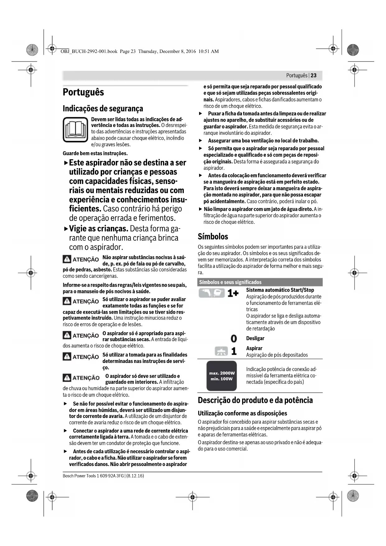 - Indicação potência de conexão admissível da ferramenta elétrica co-nectada (específica do país) OBJ_BUCH-2992-001.book Page 24 Thursday, December 8, 2016 10:51 AMPortuguês | 25 Bosch Power Tools 1 609 92A 3FG | (8.12.16) Substituir/introduzir o saco de pó (acessório) – Pressione o botão de desbloqueio 8 e retire o reservatório de pó 9 do aspirador. –Pegue na tampa 17 pelo flange de conexão 16 e retire a tampa do reservatório de pó. – Vire a tampa 17. –Insira o saco do pó 18 sobre o flange de conexão 16 do as- pirador e rode as linguetas de cartão por baixo do suporte do saco do pó 19. – Volte a pressionar a tampa 17 no reservatório de pó 9 e de- pois insira novamente o reservatório de pó no aspirador, até o mesmo engatar de forma audível. – Para retirar um saco do pó 18 cheio, rode-o – sem virar a tampa 17 – para fora do flange de conexão 16 para baixo. Funcionamento Antes de todos trabalhos no aspirador deverá puxar a ficha de rede da tomada. Colocação em funcionamento Observar a tensão de rede! A tensão da fonte de corren- te deve coincidir com a indicada na chapa de identifica- ção do aspirador. Ferramentas elétricas marcadas para 230 V também podem ser operadas com 220 V. Utilize apenas filtros não danificados (sem fissuras, sem furos etc.). Substitua imediatamente um filtro da- nificado. Para poupar energia só deverá ligar o aspirador quando ele for utilizado. Para assegurar uma potência de aspiração ideal, é necessário que a mangueira de aspiração 10 seja sempre completamen- te desenrolada da parte superior do aspirador . Aspiração de pós depositados Aspiração de pós produzidos durante o funcionamento de ferramentas elétricas (veja figura D) No aspirador está integrada uma tomada de contacto de segu- rança 4. Esta tomada serve para a conexão de uma ferramen- ta elétrica externa. Observe a máxima potência de conexão admissível da ferramenta elétrica conectada. – Monte o adaptador de aspiração 12 (ver “Adaptador de as- piração ou bico dobrado”, página 25). – Insira o adaptador de aspiração 12 no bocal de aspiração da ferramenta elétrica. Nota: Ao trabalhar com ferramentas elétricas, cuja alimenta- ção de ar na mangueira de aspiração seja reduzida (p. ex. ser- ras verticais, lixadeiras, etc.), tem de ser aberta a abertura de ar complementar 20 da mangueira de aspiração 10. Desta forma é melhorado o rendimento total do aspirador e da fer- ramenta elétrica. Para tal, rode o anel sobre a saída de ar complementar 20, até obter a abertura máxima. – Para a colocação em funcionamento do aspirador, deve- rá ligar a ferramenta elétrica conectada à tomada 4. O as- pirador arranca automaticamente. – Desligar a ferramenta elétrica para encerrar a aspiração. A função do funcionamento por inércia do automático de partida e parada continua durante 6 segundos, para aspi- rar o resto dos pós da mangueira de aspiração. Manutenção e serviço Manutenção e limpeza Antes de todos trabalhos no aspirador deverá puxar a ficha de rede da tomada. Manter o aspirador e as aberturas de ventilação sem- pre limpas, para trabalhar bem e de forma segura. Se for necessário substituir o cabo de conexão, isto deverá ser realizado pela Bosch ou por uma oficina de serviço pós- venda autorizada para todas as ferramentas elétricas Bosch para evitar riscos de segurança. Limpar a unidade de filtragem (veja figuras E1–E3) – Pressione o botão de desbloqueio 8 e retire o reservatório de pó 9 do aspirador. –Retire o filtro de tecido 21 junto com o cesto de filtro e es- cove o filtro de tecido com uma escova macia. – Pegue o filtro de pregas planas 22 pelas barras e retire-o juntamente com o respetivo cesto de filtro. Escove o filtro de pregas planas com uma escova macia ou lave-o sob água corrente e depois deixe-o secar. – Volte a colocar o filtro limpo e certifique-se do assento cor- reto e seguro. Limpar a câmara de recolha de pó – Lave o reservatório de pó 9 de tempos a tempos com um detergente convencional não abrasivo e depois deixe-o se- car bem. Limpar filtro permanente (veja figura F) Limpe o filtro permanente 24 de tempos a tempos para man- ter o rendimento ideal do aspirador. – Abra a tampa de saída de ar 23 e retire o filtro permanente