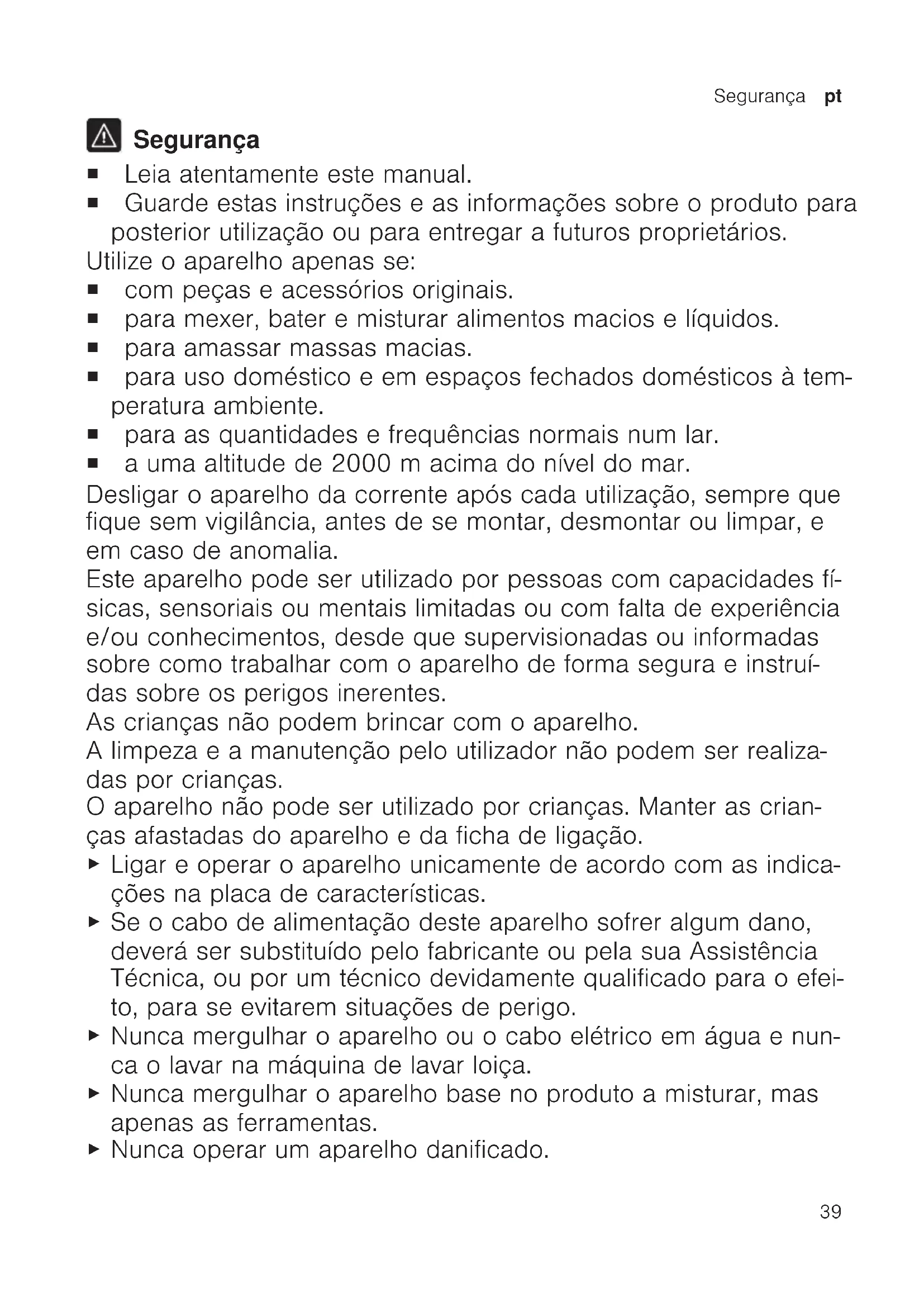 Segurança ¡ Leia atentamente este manual. ¡ Guarde estas instruções e as informações sobre o produto para posterior utilização ou para entregar a futuros proprietários. Utilize o aparelho apenas se: ¡ com peças e acessórios originais. ¡ para mexer, bater e misturar alimentos macios e líquidos. ¡ para amassar massas macias. ¡ para uso doméstico e em espaços fechados domésticos à tem- peratura ambiente. ¡ para as quantidades e frequências normais num lar. ¡ a uma altitude de 2000m acima do nível do mar. Desligar o aparelho da corrente após cada utilização, sempre que fique sem vigilância, antes de se montar, desmontar ou limpar, e em caso de anomalia. Este aparelho pode ser utilizado por pessoas com capacidades fí- sicas, sensoriais ou mentais limitadas ou com falta de experiência e/ou conhecimentos, desde que supervisionadas ou informadas sobre como trabalhar com o aparelho de forma segura e instruí- das sobre os perigos inerentes. As crianças não podem brincar com o aparelho. A limpeza e a manutenção pelo utilizador não podem ser realiza- das por crianças. O aparelho não pode ser utilizado por crianças. Manter as crian- ças afastadas do aparelho e da ficha de ligação.