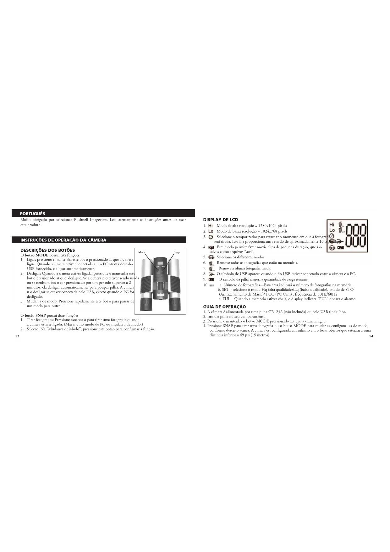 Muito obrigado por selecionar Bushnell Imageview. Leia atentamente as instruções antes de usar este produto. INSTRUÇÕES DE OPERAÇÃO DA CÂMERA