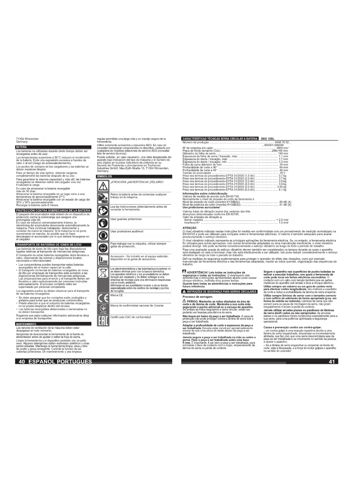 - Não transporte baterias danifi cadas ou que tenham fuga. Para instruções mais detalhadas consulte a companhia de transportes MANUTENÇÃO Manter desobstruidos os rasgos de ventilação na carcaça da máquina. Certifi que-se que desliga a ferramenta da rede eléctrica antes de instalar ou remover a lâmina serra. Limpe o aparelho e o dispositivo de protecção com um pano seco. Alguns detergentes danifi cam o plástico ou outras peças isoladas. Mantenha o aparelho limpo e seco e livre de óleo ou graxa que saiu. Verifi que a função das tampas de protecção. Uma manutenção e limpeza em intervalos regulares cuida de uma longa vida útil e de um manejo seguro. Utilizar apenas acessórios AEG e peças sobresselentes AEG. Os componentes cuja substituição não esteja descrita devem ser substituídos num serviço de assistência técnica AEG (consultar a brochura relativa à garantia/moradas dos serviços de assistência técnica). Se for necessário, um desenho de explosão do aparelho pode ser solicitado do seu posto de assistência ao cliente ou directamente da Techtronic Industries GmbH, Max-Eyth-Straße 10, 71364 Winnenden, Alemanha, indicando o tipo da máquina e o número de seis posições na chapa indicadora da potência. SYMBOLE ATENÇÃO! PERIGO! Antes de efectuar qualquer intervenção na máquina retirar o bloco acumulador. Leia atentamente o manual de instruções antes de colocar a máquina em funcionamento. Use luvas de protecção! Use protectores auriculares! Usar sempre óculos de protecção ao trabalhar com a máquina. Acessório - Não incluído no eqipamento normal, disponível como acessório. Aparelhos eléctricos, baterias/acumuladores não devem ser jogados no lixo doméstico. Os aparelhos eléctricos e as baterias devem ser colectados separadamente e entregues a uma empresa de reciclagem para a eliminação correcta. Solicite informações sobre empresas de reciclagem e postos de colecta de lixo das autoridades locais ou do seu vendedor autorizado. Marca CE Marca de conformidade nacional da Ucrânia Marca de conformidade EurAsian.4544 BKS 18BL
