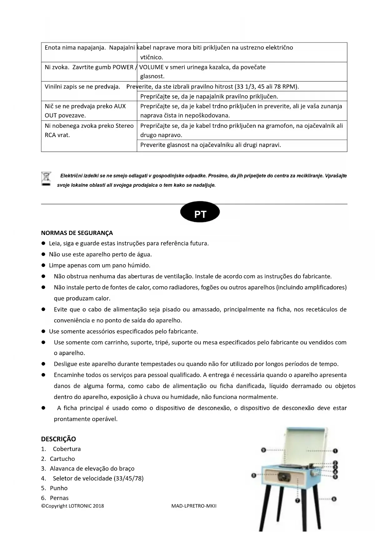 Para instalar um novo cartucho, repita o processo 3 e 4 pela ordem inversa. NOTA: Por favor, seja extremamente cuidadoso ao executar esta operação, de modo a evitar danificar o braço do tom e os fios da linha de áudio. O cartucho do gira discos precisa ser substituído a cada 3 a 4 meses após a reprodução contínua. Notes: Ao transportar o gira discos, não se esqueça de colocar a capa protetora na agulha e prender o braço de tom no suporte. Problema Solução O gira discos não liga. Assegure-se que o cabo de alimentação da unidade está conectado a uma tomada elétrica apropriada. Não tem som. Gire o botão POWER/VOLUME no sentido horário para aumentar o volume.©Copyright LOTRONIC 2018 MAD-LPRETRO-MKII 29 O disco vinil não reproduz. Verifique se selecionou a velocidade correta (33 1/3, 45 ou 78 RPM). Verifique se o adaptador de energia está corretamente ligado. Não é possível reproduzir a partir da saída AUX. Certifique-se que o cabo está firmemente ligado e verifique se o seu dispositivo externo está limpo e sem danos. Não há som através da porta RCA Stereo. Verifique se o cabo está firmemente ligado ao gira discos e ao amplificador ou outro dispositivo. Verifique o volume no seu amplificador ou outro dispositivo.