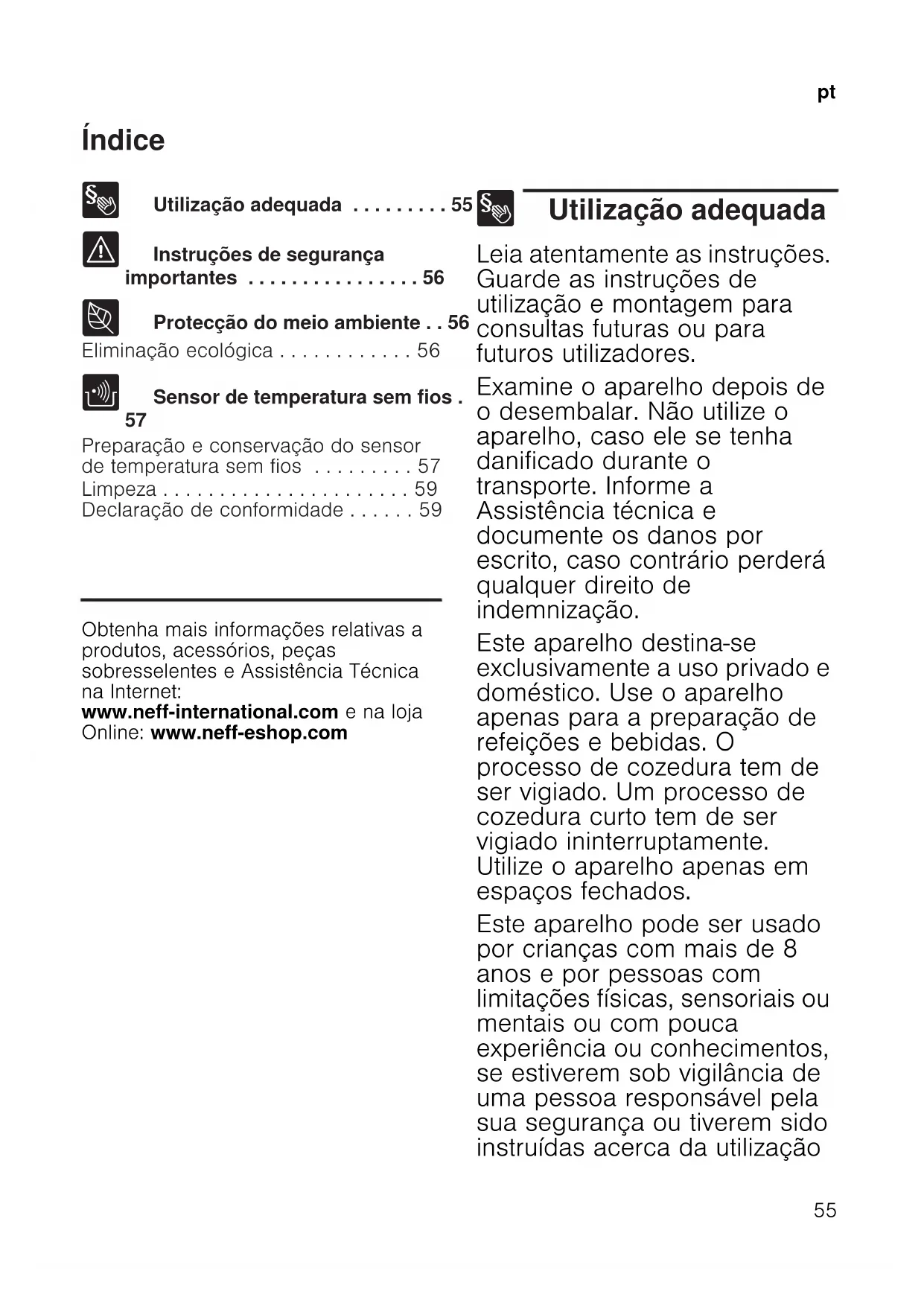 Preparação e conservação do sensor de temperatura sem fios . . . . . . . . . 57 Limpeza . . . . . . . . . . . . . . . . . . . . . . 59 Declaração de conformidade . . . . . . 59 Produktinfo Obtenha mais informações relativas a produtos, acessórios, peças sobresselentes e Assistência Técnica na Internet: www.neff-international.com e na loja Online: www.neff-eshop.com 8 Utilização adequada Utilização adequada Leia atentamente as instruções. Guarde as instruções de utilização e montagem para consultas futuras ou para futuros utilizadores. Examine o aparelho depois de o desembalar. Não utilize o aparelho, caso ele se tenha danificado durante o transporte. Informe a Assistência técnica e documente os danos por escrito, caso contrário perderá qualquer direito de indemnização. Este aparelho destina-se exclusivamente a uso privado e doméstico. Use o aparelho apenas para a preparação de refeições e bebidas. O processo de cozedura tem de ser vigiado. Um processo de cozedura curto tem de ser vigiado ininterruptamente. Utilize o aparelho apenas em espaços fechados. Este aparelho pode ser usado por crianças com mais de 8 anos e por pessoas com limitações físicas, sensoriais ou mentais ou com pouca experiência ou conhecimentos, se estiverem sob vigilância de uma pessoa responsável pela sua segurança ou tiverem sido instruídas acerca da utilizaçãopt