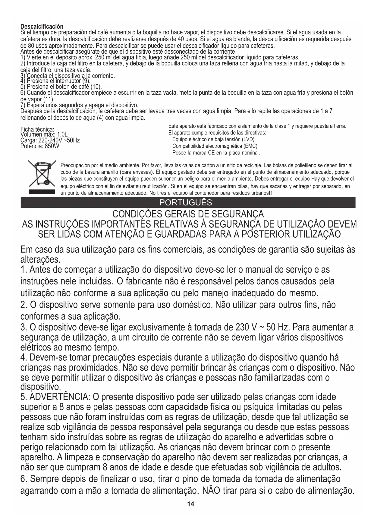 Após a descalcificação a cafeteira deve ser lavada três vezes com água limpa. Para isso, repete as operações de 1 a 7 enchendo o depósito de água (4) com água limpa. Dados técnicos: Capacidade max: 1,0L Tensão: 220-240V ~50Hz Potência: 850W Dispositivo fabricado com classe de isolamento I e não precisa de ligação à terra. Dispositivo está conforme com os requisitos das diretivas: Dispositivo elétrico de baixa voltagem (LVD) Compatibilidade eletromagnética (EMC) Produto com símbolo CE na placa de características.Protecção do meio ambiente. Rogamos, os embalagens de cartão destinem-se para papéis velhos. Os sacos de polietileno (PE) devem-se colocar em contenedores para material plástico. O dispositivo usado deve-se levar a um ponto de armazenamento adequado porque os componentes perigosos que ficam dentro do dispositivo podem ser perigosos para o meio ambiente. O dispositivo elétrico deve-se entregar de modo que se reduza a sua nova utilização e uso. Se no dispositivo há pilhas, devem-se tirar e levar a um ponto de armazenamento em separado. Não colocar o dispositivo em contenedores para resíduos municipais!! LIETUVIŲ BENDROSIOS SAUGOS SĄLYGOS. SVARBIAS SAUGAUS NAUDOJIMO INSTRUKCIJAS BŪTINA ATIDŽIAI PERSKAITYTI IR IŠSAUGOTI ATEIČIAI