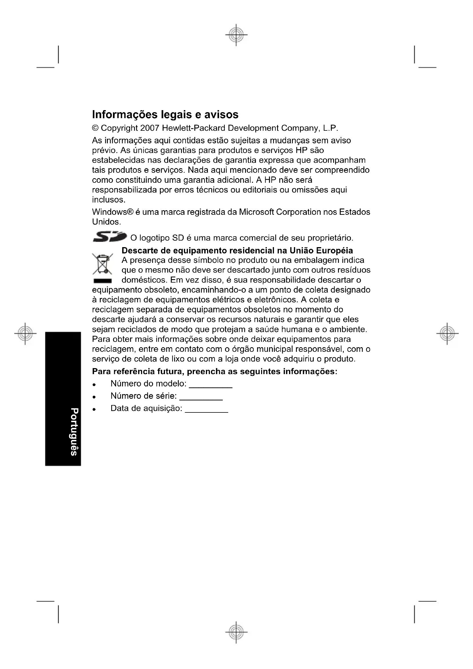 - Als u de camera alleen gebruikt om opnames te bekijken, schuift u naar voordat u de camera inschakelt in Weergave. De lens wordt dan niet uitgeschoven als u de camera inschakelt. Beknopt overzicht van camerafuncties 23 Nederlands• Als u opnames overbrengt of afdrukt, kunt u de camera in een optioneel HP Photosmart dock plaatsen dat is aangesloten op de netvoeding. Voor meer informatie over batterijen gaat u naar www.hp.com/support en zoekt u op de code AA-400 of raadpleegt u Bijlage A in de elektronische Gebruikershandleiding. 24 HP Photosmart M440/M540/M630 series NederlandsHP Photosmart M440/M540/ M630 series PortuguêsInformações legais e avisos © Copyright 2007 Hewlett-Packard Development Company, L.P. As informações aqui contidas estão sujeitas a mudanças sem aviso prévio. As únicas garantias para produtos e serviços HP são estabelecidas nas declarações de garantia expressa que acompanham tais produtos e serviços. Nada aqui mencionado deve ser compreendido como constituindo uma garantia adicional. A HP não será responsabilizada por erros técnicos ou editoriais ou omissões aqui inclusos. Windows® é uma marca registrada da Microsoft Corporation nos Estados Unidos. O logotipo SD é uma marca comercial de seu proprietário. Descarte de equipamento residencial na União Européia A presença desse símbolo no produto ou na embalagem indica que o mesmo não deve ser descartado junto com outros resíduos domésticos. Em vez disso, é sua responsabilidade descartar o equipamento obsoleto, encaminhando-o a um ponto de coleta designado à reciclagem de equipamentos elétricos e eletrônicos. A coleta e reciclagem separada de equipamentos obsoletos no momento do descarte ajudará a conservar os recursos naturais e garantir que eles sejam reciclados de modo que protejam a saúde humana e o ambiente. Para obter mais informações sobre onde deixar equipamentos para reciclagem, entre em contato com o órgão municipal responsável, com o serviço de coleta de lixo ou com a loja onde você adquiriu o produto. Para referência futura, preencha as seguintes informações: