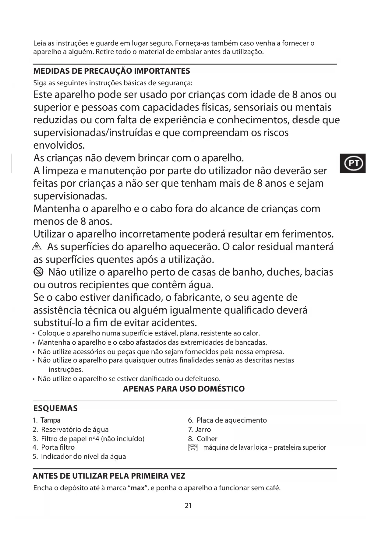 Siga as seguintes instruções básicas de segurança: Este aparelho pode ser usado por crianças com idade de 8 anos ou superior e pessoas com capacidades físicas, sensoriais ou mentais reduzidas ou com falta de experiência e conhecimentos, desde que supervisionadas/instruídas e que compreendam os riscos envolvidos. As crianças não devem brincar com o aparelho. A limpeza e manutenção por parte do utilizador não deverão ser feitas por crianças a não ser que tenham mais de 8 anos e sejam supervisionadas. Mantenha o aparelho e o cabo fora do alcance de crianças com menos de 8 anos. Utilizar o aparelho incorretamente poderá resultar em ferimentos. h As superfícies do aparelho aquecerão. O calor residual manterá as superfícies quentes após a utilização. b Não utilize o aparelho perto de casas de banho, duches, bacias ou outros recipientes que contêm água. Se o cabo estiver danicado, o fabricante, o seu agente de assistência técnica ou alguém igualmente qualicado deverá substituí-lo a m de evitar acidentes.
