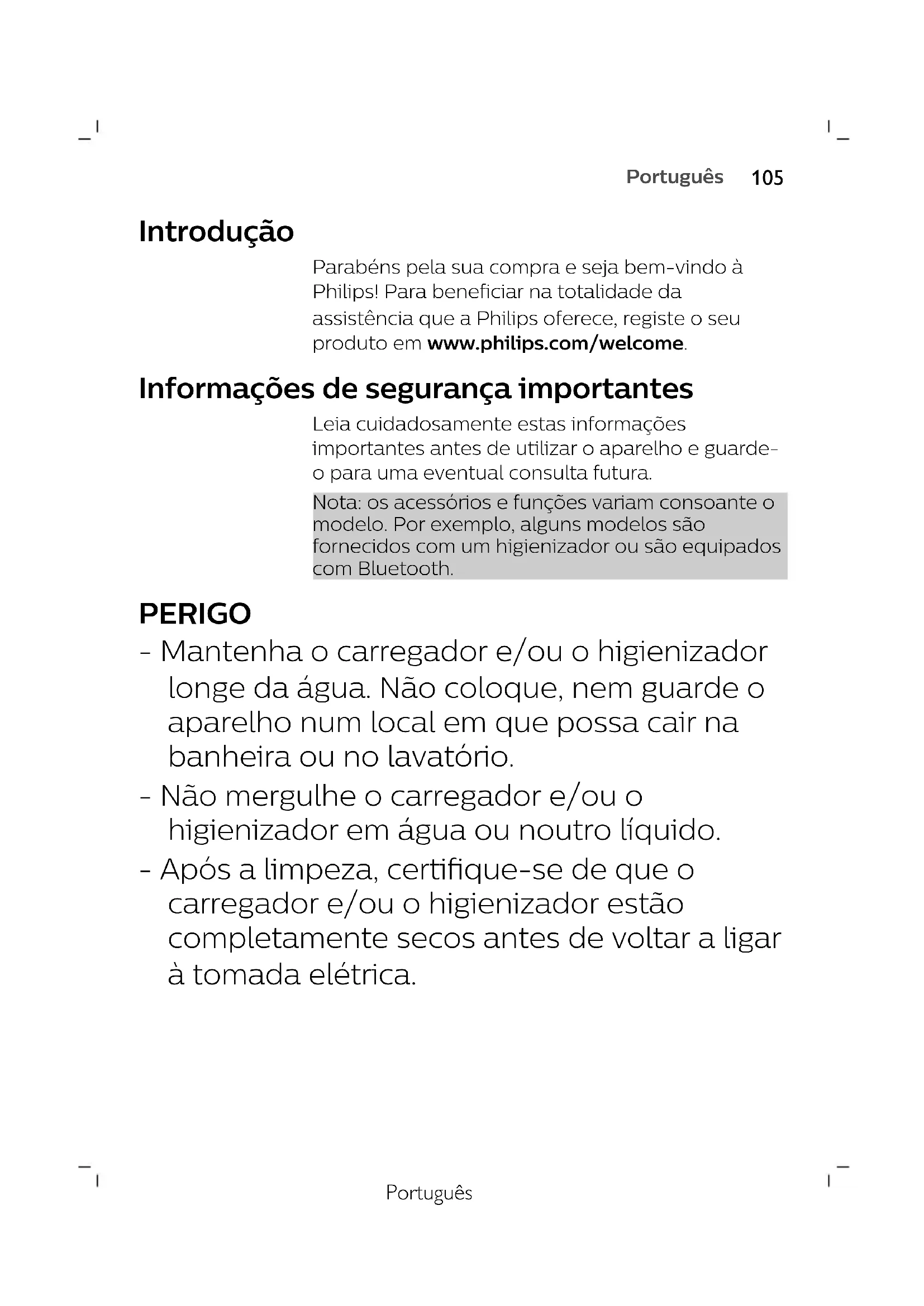 NederlandsPortuguês Introdução Parabéns pela sua compra e seja bem-vindo à Philips! Para beneficiar na totalidade da assistência que a Philips oferece, registe o seu produto em www.philips.com/welcome. Informações de segurança importantes Leia cuidadosamente estas informações importantes antes de utilizar o aparelho e guarde- o para uma eventual consulta futura. Nota: os acessórios e funções variam consoante o modelo. Por exemplo, alguns modelos são fornecidos com um higienizador ou são equipados com Bluetooth. PERIGO - Mantenha o carregador e/ou o higienizador longe da água. Não coloque, nem guarde o aparelho num local em que possa cair na banheira ou no lavatório. - Não mergulhe o carregador e/ou o higienizador em água ou noutro líquido. - Após a limpeza, certifique-se de que o carregador e/ou o higienizador estão completamente secos antes de voltar a ligar à tomada elétrica.