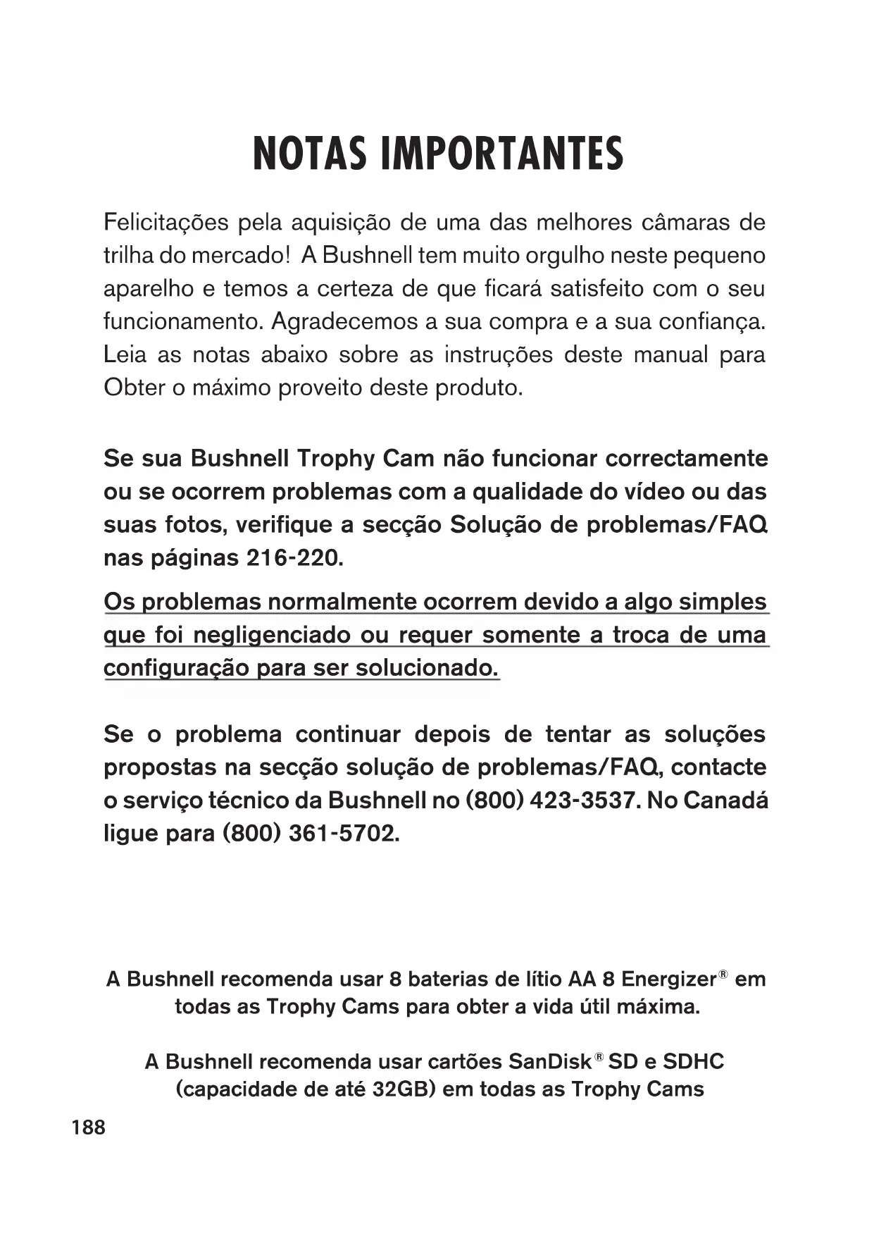 Modelo nº: 119436 / 119446 / 119456Lit# 98-1517 / 4-11 POrTuGuêS188 NOTAS IMPOrTANTES Felicitações pela aquisição de uma das melhores câmaras de trilha do mercado! A Bushnell tem muito orgulho neste pequeno aparelho e temos a certeza de que ficará satisfeito com o seu funcionamento. Agradecemos a sua compra e a sua confiança. Leia as notas abaixo sobre as instruções deste manual para Obter o máximo proveito deste produto. Se sua Bushnell Trophy Cam não funcionar correctamente ou se ocorrem problemas com a qualidade do vídeo ou das suas fotos, verifique a secção Solução de problemas/FAQ nas páginas 216-220. Os problemas normalmente ocorrem devido a algo simples que foi negligenciado ou requer somente a troca de uma configuração para ser solucionado. Se o problema continuar depois de tentar as soluções propostas na secção solução de problemas/FAQ, contacte o serviço técnico da Bushnell no (800) 423-3537. No Canadá ligue para (800) 361-5702. A Bushnell recomenda usar 8 baterias de lítio AA 8 Energizer