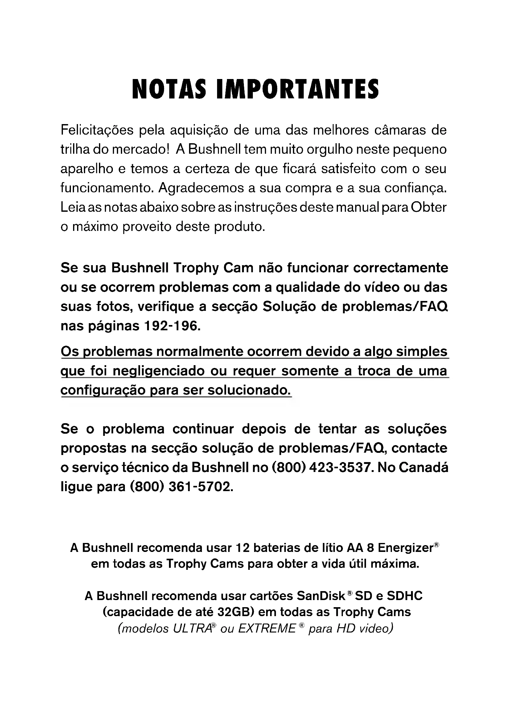 em todas as Trophy Cams para obter a vida útil máxima. A Bushnell recomenda usar cartões SanDisk