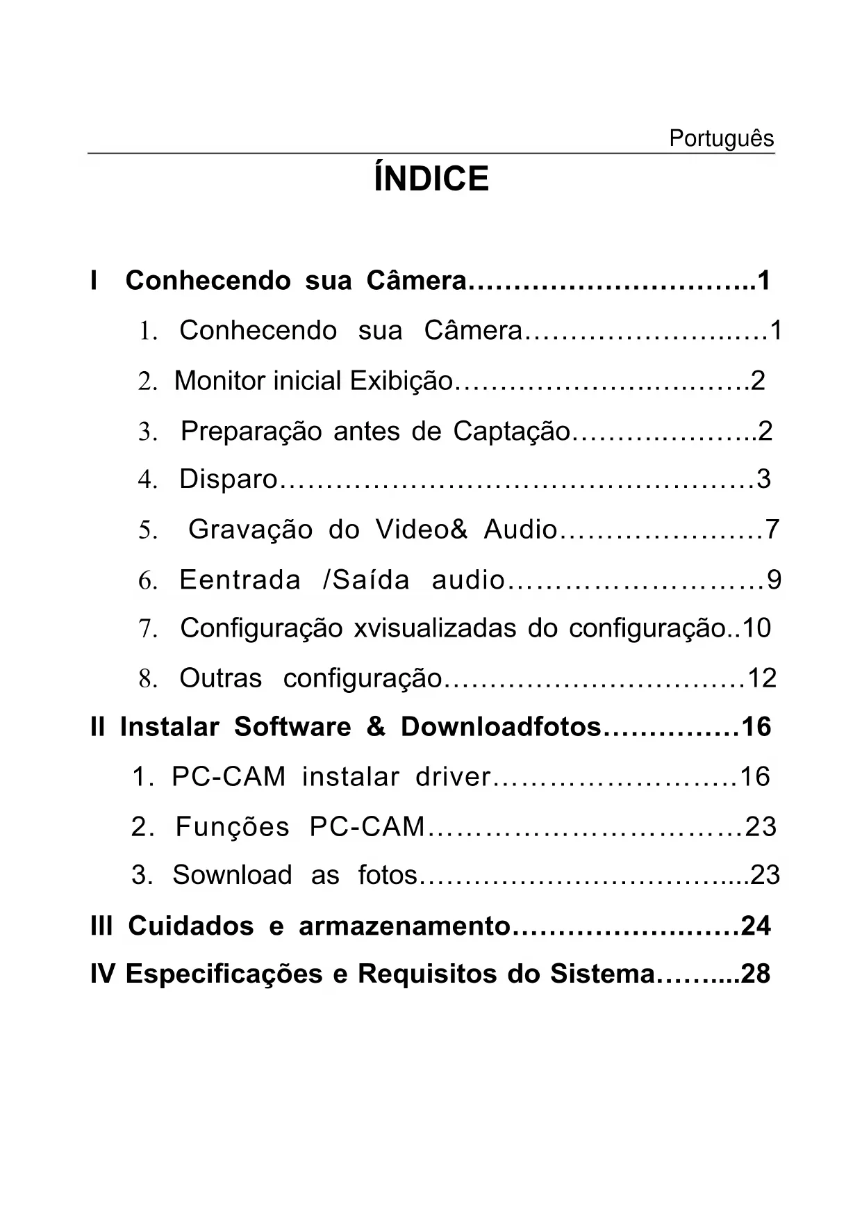 III Cuidados e armazenamento……………….……24 IV Especificações e Requisitos do Sistema……....28 Português1