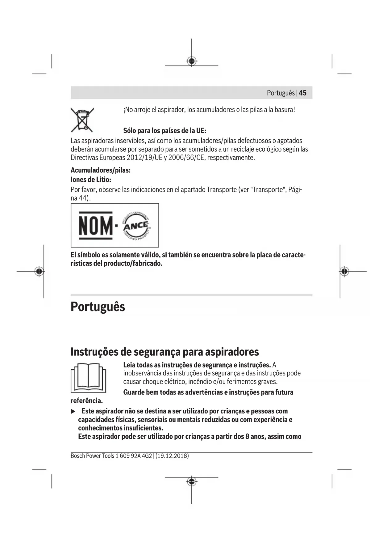 10...+50 Baterias recomendadas 1 607 A35 08. Fonte de alimentação recomendada 1 600 A01 6A. A) potência limitada com temperaturas <0 °C Dados técnicos averiguados com o acumulador fornecido. Montagem u Retire o acumulador antes de efetuar trabalhos de limpeza ou manutenção, ajustes no aparelho, troca de acessórios ou de armazenar o aspirador. Esta medida de prevenção evita um arranque inadvertido do aspirador. Carregar a bateria (ver imagem A) u Utilize apenas a fonte de alimentação listada nos dados técnicos. Apenas esta fonte de alimentação é indicada para a bateria de lítio utilizada no seu aspirador. 1 609 92A 4G2 | (19.12.2018) Bosch Power ToolsPortuguês | 49 Nota: A bateria é fornecida parcialmente carregada. Para assegurar a máxima potência da bateria, a bateria deverá ser carregada completamente com a fonte de alimentação antes da primeira utilização. A bateria de lítio pode ser carregada a qualquer altura, sem que a sua vida útil seja reduzida. Uma interrupção do processo de carga não danifica a bateria. O acumulador de iões de lítio está protegido contra descarga completa pelo sistema "Electronic Cell Protection (ECP)". Com a bateria descarregada, o aspirador é desligado através de uma comutação de proteção. u Depois do desligamento automático do aspirador não pressione mais a tecla de ligar/desligar. A bateria pode ser danificada. A bateria está equipada com uma monitorização de temperatura NTC, que só permite uma carga na faixa de temperatura entre 10 °C e 35 °C. Desta forma é alcançada uma alta vida útil da bateria. Pode carregar a bateria (3) individualmente ou no aspirador. – Abra a cobertura (6). – Ligue a bateria (3) com um cabo USB (11) à fonte de alimentação (10). – Ligue a fonte de alimentação (10) à tomada. O processo de carga começa. O indicador do nível de carga da bateria (4) mostra o processo de carregamento. Durante o processo de carga o aspirador está desativado e não pode ser operado. Em caso de não utilização prolongada, desligue a fonte de alimentação (10) da rede elétrica. Colocação/remoção da bateria (ver figuras B1−B2) u Não coloque a bateria com violência. A bateria está construída de forma a só poder ser encaixada no aspirador na posição certa. – Introduza a bateria (3) até ao limitador no compartimento da bateria(12). – Para remover a bateria (3) prima as teclas de desbloqueio(13) na bateria e retire-a do respetivo compartimento(12). Observe as indicações sobre a eliminação de forma ecológica. Indicador do nível de carga da bateria O indicador do nível de carga da bateria (4) é ativado automaticamente assim que a bateria (3) é movimentada. O indicador do nível de carga da bateria (4) desliga-se após alguns segundos se a bateria (3) não for mais movimentada. Durante o processo de trabalho com o aspirador, o indicador do nível de carga da bateria (4) está desligado. Bosch Power Tools 1 609 92A 4G2 | (19.12.2018)50 | Português Carregamento Bateria em separado ou no aspirador (com movimento) Processo de carga (bateria com fonte de alimentação ligada) 100 % Verde (permanentemente) Verde (permanentemente) 100 %−50 % Verde (permanentemente) Verde (intermitente) 50 %−20 % Amarelo (permanentemente) Verde (intermitente) 20 %−5 % Vermelho (permanentemente) Verde (intermitente) 5 %−0 % Vermelho (intermitente) Verde (intermitente) Nota: Após um armazenamento ou um período de não utilização prolongado da bateria (3) é possível que o indicador do nível de carga da bateria (4) não seja ativado. Isto protege a bateria (3) contra descarga completa. Assim que a bateria (3) for carregada, o indicador é ativado novamente. Neste caso, o tempo de carga prolonga-se. O indicador do nível de carga da bateria (4) desliga-se alguns minutos depois de a bateria (3) ter sido completamente carregada. Nota: Se o indicador do nível de carga da bateria (4) piscar a branco, a temperatura encontra-se fora da temperatura ambiente admissível. O processo de carga inicia-se automaticamente assim que a faixa de temperatura admissível seja novamente alcançada. Durante o processo de carga, o indicador do nível de carga da bateria (4) pisca a verde. Montar acessórios de aspiração Os acessórios de aspiração podem ser conectados ao do reservatório de pó (8). – Introduza bem os acessórios de aspiração no conector no reservatório de pó (8) e entre eles. Funcionamento u Retire o acumulador antes de efetuar trabalhos de limpeza ou manutenção, ajustes no aparelho, troca de acessórios ou de armazenar o aspirador. Esta medida de prevenção evita um arranque inadvertido do aspirador. u Certifique-se de que a cobertura da tomada USB Type-C
