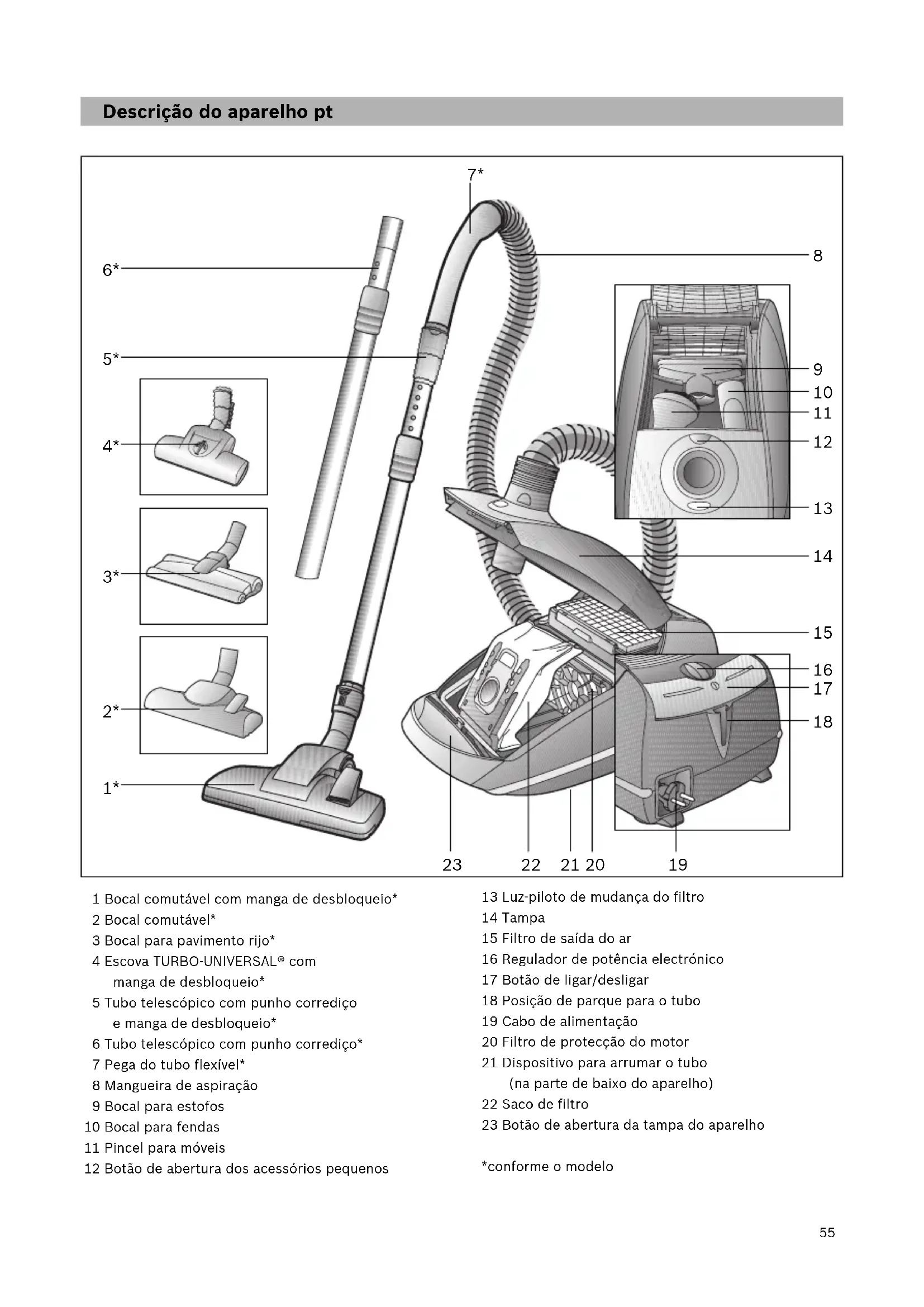 Nível de potência alto: Para a limpeza de pavimentos robustos, soalhos rijos e em caso de muita sujidade. b)Air Turbo: para muita sujidade e lixo. O aparelho aspira com a potência de sucção máxima possível. Figura Regular o bocal: a)Para aspirar tapetes e alcatifas => b)Para aspirar soalhos rijos => Atenção! Dependendo das características do pavimento (p.ex., azulejos ásperos ou rústicos), os bocais estão sujeitos a certo desgaste. Por conseguinte, deve verificar regularmente a sola do bocal. Bocais com solas desgastadas e arestas vivas podem danificar pavimentos delicados como o parquete ou o linóleo. O fabricante não se responsabiliza por eventuais danos causados por um bocal desgastado. Escova Turbo Caso o seu aparelho esteja equipado com uma escova Turbo, queira consultar as recomendações de utilização e manutenção que constam do manual de instruções em anexo. Os acessórios pequenos de que não precisar podem, para grande comodidade, ser colocados no compartimento de acessórios que se encontra na tampa do aparelho. Figura Premindo o botão de abertura, a tampa do compartimento dos acessórios abre-se automaticamente. Retire os acessórios pretendidos. Figura Depois de os retirar, feche e encaixe a tampa do compartimento dos acessórios.