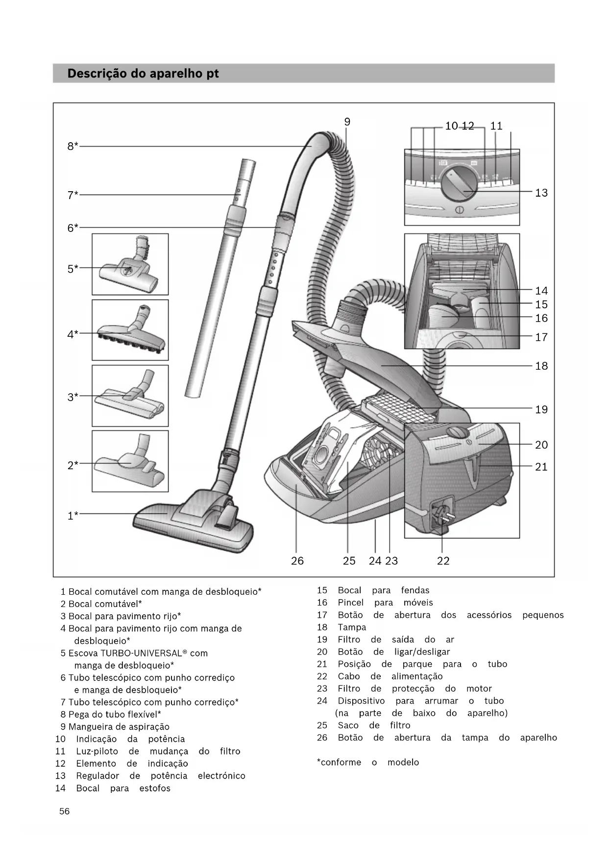 Nível de potência alto: Para a limpeza de pavimentos robustos, soalhos rijos e em caso de muita sujidade. b)Air Power: para muita sujidade e lixo. O aparelho aspira com a potência de sucção máxima possível. Figura Regular o bocal: a)Para aspirar tapetes e alcatifas => b)Para aspirar soalhos rijos => Atenção! Dependendo das características do pavimento (p.ex., azulejos ásperos ou rústicos), os bocais estão sujeitos a certo desgaste. Por conseguinte, deve verificar regularmente a sola do bocal. Bocais com solas desgastadas e arestas vivas podem danificar pavimentos delicados como o parquete ou o linóleo. O fabricante não se responsabiliza por eventuais danos causados por um bocal desgastado. Escova Turbo Caso o seu aparelho esteja equipado com uma escova Turbo, queira consultar as recomendações de utilização e manutenção que constam do manual de instruções em anexo. Os acessórios pequenos de que não precisar podem, para grande comodidade, ser colocados no compartimento de acessórios que se encontra na tampa do aparelho. Figura Premindo o botão de abertura, a tampa do compartimento dos acessórios abre-se automaticamente. Retire os acessórios pretendidos. Figura Depois de os retirar, feche e encaixe a tampa do compartimento dos acessórios.