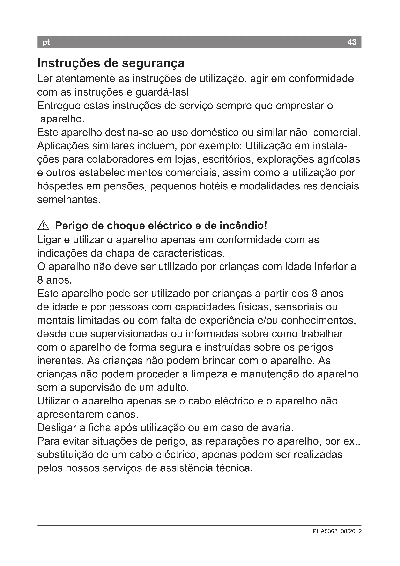Perigo de choque eléctrico e de incêndio! Ligareutilizaroaparelhoapenasemconformidadecomas indicaçõesdachapadecaracterísticas. Oaparelhonãodeveserutilizadoporcriançascomidadeinferiora 8anos. Esteaparelhopodeserutilizadoporcriançasapartirdos8anos deidadeeporpessoascomcapacidadesfísicas,sensoriaisou mentaislimitadasoucomfaltadeexperiênciae/ouconhecimentos, desdequesupervisionadasouinformadassobrecomotrabalhar comoaparelhodeformaseguraeinstruídassobreosperigos inerentes.Ascriançasnãopodembrincarcomoaparelho.As criançasnãopodemprocederàlimpezaemanutençãodoaparelho semasupervisãodeumadulto. Utilizaroaparelhoapenasseocaboeléctricoeoaparelhonão apresentaremdanos. Desligarachaapósutilizaçãoouemcasodeavaria. Paraevitarsituaçõesdeperigo,asreparaçõesnoaparelho,porex., substituiçãodeumcaboeléctrico,apenaspodemserrealizadas pelosnossosserviçosdeassistênciatécnica.44 RobertBoschHausgeräteGmbH 44 pt Nunca ● deixarocabopertodepeçasquentes; ● puxarocabosobrearestasvivas; ● utilizarocabocomopega. Antesdelimparoaparelho,desligarachadatomada. Nãocolocaroaparelhoemcontactocomágua. Nãoutilizaraparelhodelimpezaavapor. Aescovaaquece. Nãotocar,deixararrefecerprimeiro. Nãoutilizaremcabelomuitomolhado,nememcabeloarticial. Não utilizar na proximidade de banheiras, lavatórios ou outros recipientes com água.
