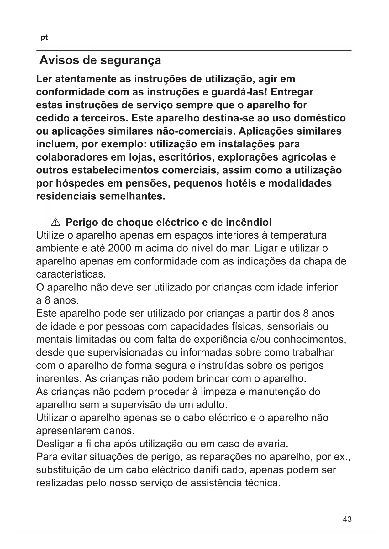 Avisos de segurança Ler atentamente as instruções de utilização, agir em conformidade com as instruções e guardá-las! Entregar estas instruções de serviço sempre que o aparelho for cedido a terceiros. Este aparelho destina-se ao uso doméstico ou aplicações similares não-comerciais. Aplicações similares incluem, por exemplo: utilização em instalações para colaboradores em lojas, escritórios, explorações agrícolas e outros estabelecimentos comerciais, assim como a utilização por hóspedes em pensões, pequenos hotéis e modalidades residenciais semelhantes. A Perigo de choque eléctrico e de incêndio! Utilize o aparelho apenas em espaços interiores à temperatura ambiente e até 2000 m acima do nível do mar. Ligar e utilizar o aparelho apenas em conformidade com as indicações da chapa de características. O aparelho não deve ser utilizado por crianças com idade inferior a 8 anos. Este aparelho pode ser utilizado por crianças a partir dos 8 anos de idade e por pessoas com capacidades físicas, sensoriais ou mentais limitadas ou com falta de experiência e/ou conhecimentos, desde que supervisionadas ou informadas sobre como trabalhar com o aparelho de forma segura e instruídas sobre os perigos inerentes. As crianças não podem brincar com o aparelho. As crianças não podem proceder à limpeza e manutenção do aparelho sem a supervisão de um adulto. Utilizar o aparelho apenas se o cabo eléctrico e o aparelho não apresentarem danos. Desligar a cha após utilização ou em caso de avaria. Para evitar situações de perigo, as reparações no aparelho, por ex., substituição de um cabo eléctrico dani cado, apenas podem ser realizadas pelo nosso serviço de assistência técnica.44