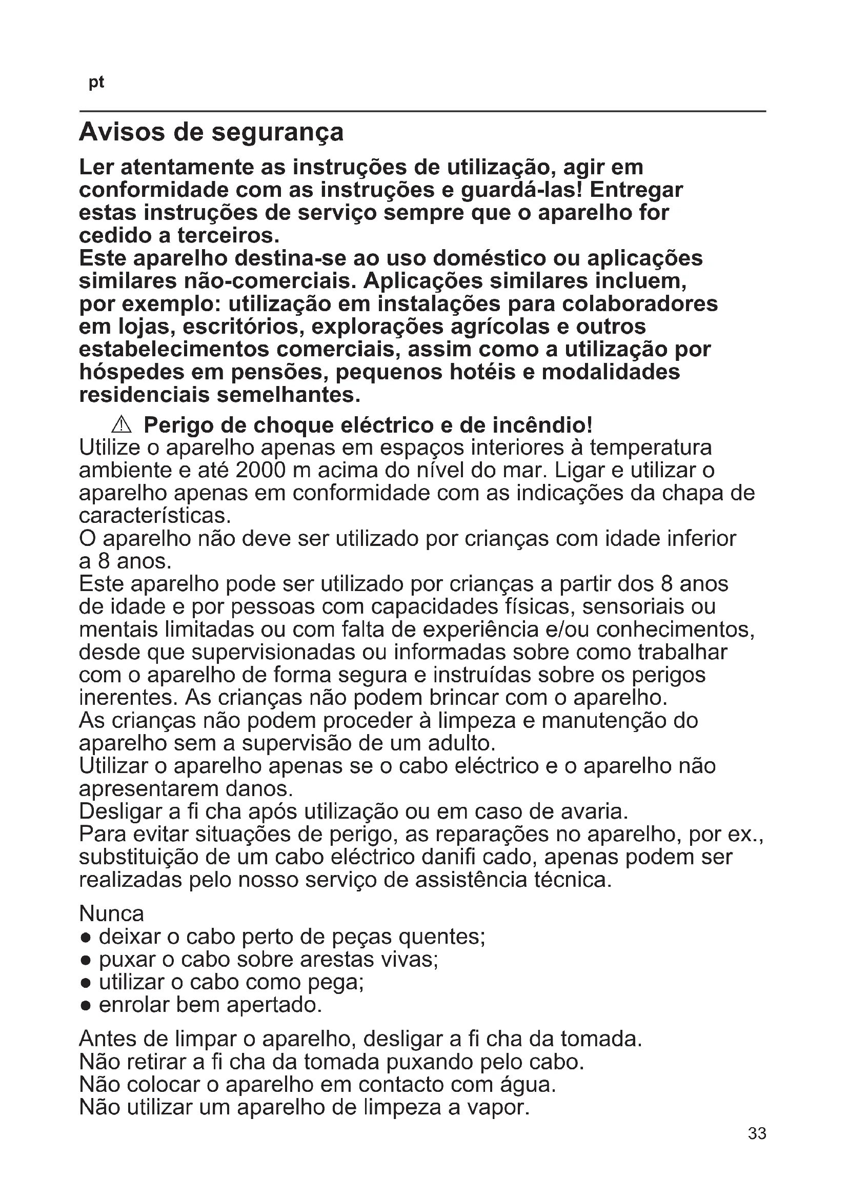 Avisos de segurança Ler atentamente as instruções de utilização, agir em conformidade com as instruções e guardá-las! Entregar estas instruções de serviço sempre que o aparelho for cedido a terceiros. Este aparelho destina-se ao uso doméstico ou aplicações similares não-comerciais. Aplicações similares incluem, por exemplo: utilização em instalações para colaboradores em lojas, escritórios, explorações agrícolas e outros estabelecimentos comerciais, assim como a utilização por hóspedes em pensões, pequenos hotéis e modalidades residenciais semelhantes. A Perigo de choque eléctrico e de incêndio! Utilize o aparelho apenas em espaços interiores à temperatura ambiente e até 2000 m acima do nível do mar. Ligar e utilizar o aparelho apenas em conformidade com as indicações da chapa de características. O aparelho não deve ser utilizado por crianças com idade inferior a 8 anos. Este aparelho pode ser utilizado por crianças a partir dos 8 anos de idade e por pessoas com capacidades físicas, sensoriais ou mentais limitadas ou com falta de experiência e/ou conhecimentos, desde que supervisionadas ou informadas sobre como trabalhar com o aparelho de forma segura e instruídas sobre os perigos inerentes. As crianças não podem brincar com o aparelho. As crianças não podem proceder à limpeza e manutenção do aparelho sem a supervisão de um adulto. Utilizar o aparelho apenas se o cabo eléctrico e o aparelho não apresentarem danos. Desligar a cha após utilização ou em caso de avaria. Para evitar situações de perigo, as reparações no aparelho, por ex., substituição de um cabo eléctrico dani cado, apenas podem ser realizadas pelo nosso serviço de assistência técnica. Nunca ● deixar o cabo perto de peças quentes; ● puxar o cabo sobre arestas vivas; ● utilizar o cabo como pega; ● enrolar bem apertado. Antes de limpar o aparelho, desligar a cha da tomada. Não retirar a cha da tomada puxando pelo cabo. Não colocar o aparelho em contacto com água. Não utilizar um aparelho de limpeza a vapor.34
