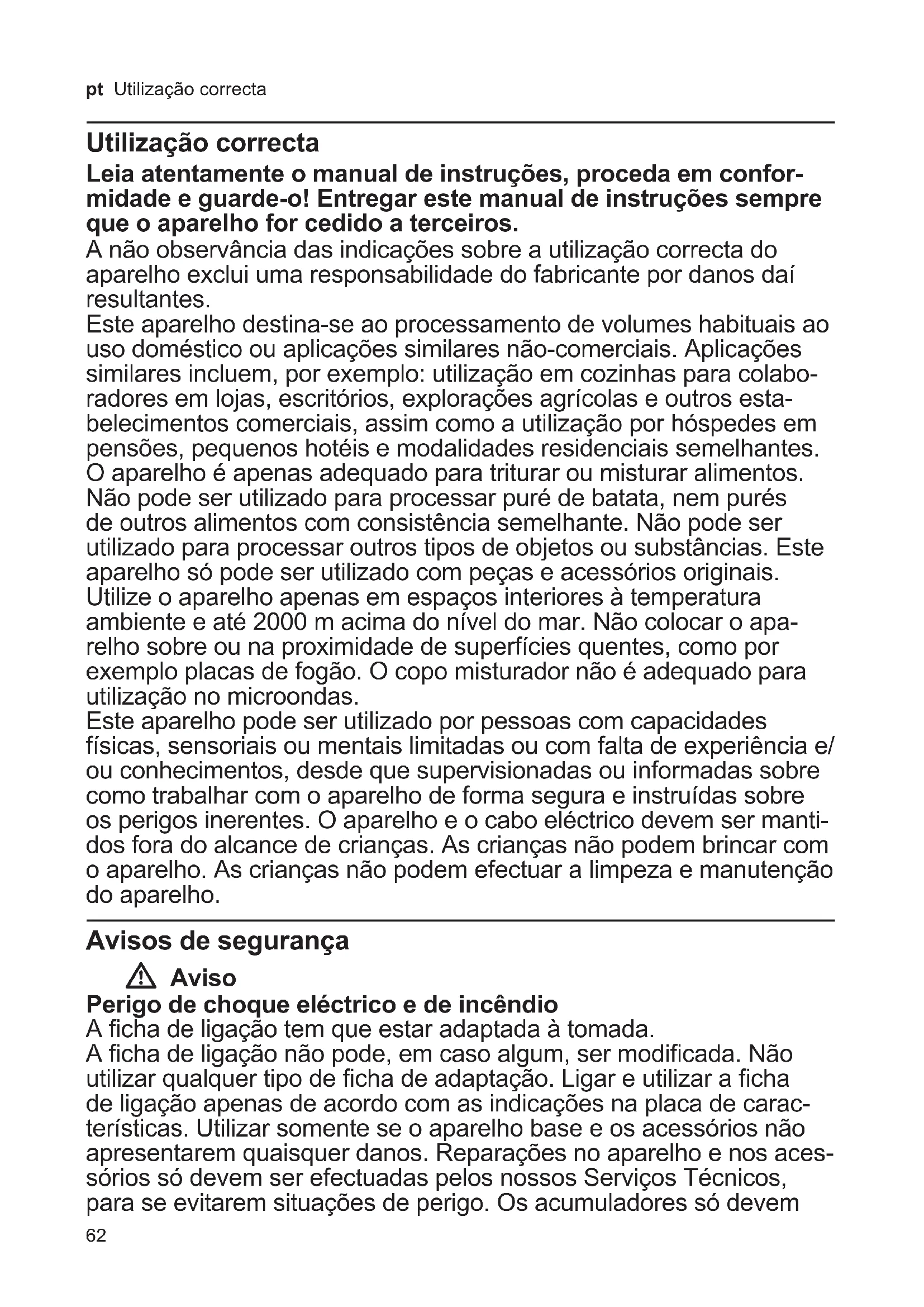 COMPRA. Todos nuestros técnicos van provistos del correspondiente carnet avalado por ANFEL (Asociación Nacional de Fabricantes de Elec- trodomésticos) que le acredita como Servicio Autorizado de Bosch. Reservado el derecho a cambios y modi caciones sin previo aviso.62 pt Utilização correcta Utilização correcta Leia atentamente o manual de instruções, proceda em confor- midade e guarde-o! Entregar este manual de instruções sempre que o aparelho for cedido a terceiros. A não observância das indicações sobre a utilização correcta do aparelho exclui uma responsabilidade do fabricante por danos daí resultantes. Este aparelho destina-se ao processamento de volumes habituais ao uso doméstico ou aplicações similares não-comerciais. Aplicações similares incluem, por exemplo: utilização em cozinhas para colabo- radores em lojas, escritórios, explorações agrícolas e outros esta- belecimentos comerciais, assim como a utilização por hóspedes em pensões, pequenos hotéis e modalidades residenciais semelhantes. O aparelho é apenas adequado para triturar ou misturar alimentos. Não pode ser utilizado para processar puré de batata, nem purés de outros alimentos com consistência semelhante. Não pode ser utilizado para processar outros tipos de objetos ou substâncias. Este aparelho só pode ser utilizado com peças e acessórios originais. Utilize o aparelho apenas em espaços interiores à temperatura ambiente e até 2000 m acima do nível do mar. Não colocar o apa- relho sobre ou na proximidade de superfícies quentes, como por exemplo placas de fogão. O copo misturador não é adequado para utilização no microondas. Este aparelho pode ser utilizado por pessoas com capacidades físicas, sensoriais ou mentais limitadas ou com falta de experiência e/ ou conhecimentos, desde que supervisionadas ou informadas sobre como trabalhar com o aparelho de forma segura e instruídas sobre os perigos inerentes. O aparelho e o cabo eléctrico devem ser manti- dos fora do alcance de crianças. As crianças não podem brincar com o aparelho. As crianças não podem efectuar a limpeza e manutenção do aparelho. Avisos de segurança W Aviso Perigo de choque eléctrico e de incêndio A cha de ligação tem que estar adaptada à tomada. A cha de ligação não pode, em caso algum, ser modicada. Não utilizar qualquer tipo de cha de adaptação. Ligar e utilizar a cha de ligação apenas de acordo com as indicações na placa de carac- terísticas. Utilizar somente se o aparelho base e os acessórios não apresentarem quaisquer danos. Reparações no aparelho e nos aces- sórios só devem ser efectuadas pelos nossos Serviços Técnicos, para se evitarem situações de perigo. Os acumuladores só devem63