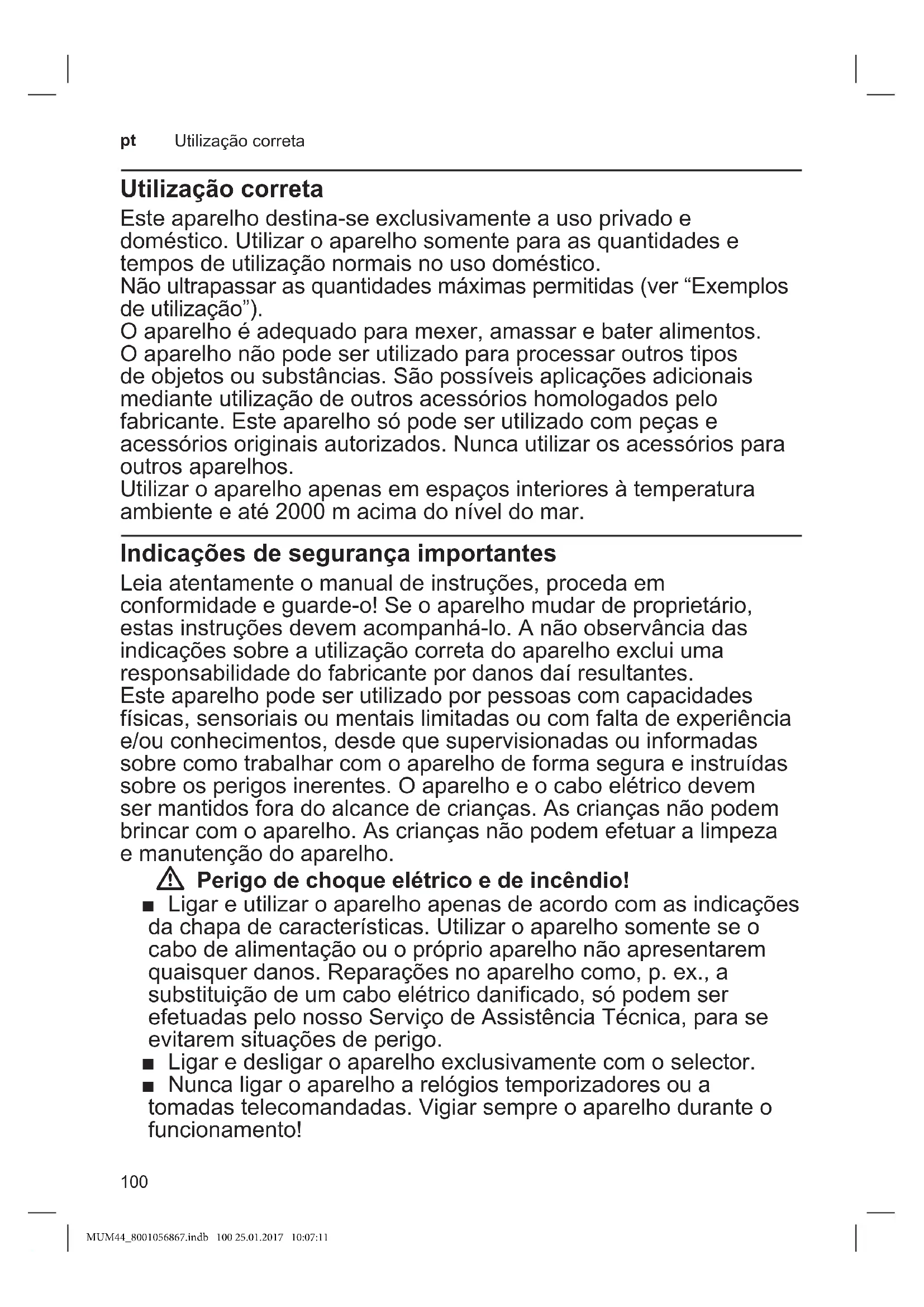 Utilização correta Utilização correta Este aparelho destinase exclusivamente a uso privado e doméstico. Utilizar o aparelho somente para as quantidades e tempos de utilização normais no uso doméstico. Não ultrapassar as quantidades máximas permitidas (ver “Exemplos de utilização”). O aparelho é adequado para mexer, amassar e bater alimentos. O aparelho não pode ser utilizado para processar outros tipos de objetos ou substâncias. São possíveis aplicações adicionais mediante utilização de outros acessórios homologados pelo fabricante. Este aparelho só pode ser utilizado com peças e acessórios originais autorizados. Nunca utilizar os acessórios para outros aparelhos. Utilizar o aparelho apenas em espaços interiores à temperatura ambiente e até 2000 m acima do nível do mar. Indicações de segurança importantes Leia atentamente o manual de instruções, proceda em conformidade e guardeo! Se o aparelho mudar de proprietário, estas instruções devem acompanhálo. A não observância das indicações sobre a utilização correta do aparelho exclui uma responsabilidade do fabricante por danos daí resultantes. Este aparelho pode ser utilizado por pessoas com capacidades físicas, sensoriais ou mentais limitadas ou com falta de experiência e/ou conhecimentos, desde que supervisionadas ou informadas sobre como trabalhar com o aparelho de forma segura e instruídas sobre os perigos inerentes. O aparelho e o cabo elétrico devem ser mantidos fora do alcance de crianças. As crianças não podem brincar com o aparelho. As crianças não podem efetuar a limpeza e manutenção do aparelho. W Perigo de choque elétrico e de incêndio! ■ Ligar e utilizar o aparelho apenas de acordo com as indicações da chapa de características. Utilizar o aparelho somente se o cabo de alimentação ou o próprio aparelho não apresentarem quaisquer danos. Reparações no aparelho como, p. ex., a substituição de um cabo elétrico danificado, só podem ser efetuadas pelo nosso Serviço de Assistência Técnica, para se evitarem situações de perigo. ■ Ligar e desligar o aparelho exclusivamente com o selector. ■ Nunca ligar o aparelho a relógios temporizadores ou a tomadas telecomandadas. Vigiar sempre o aparelho durante o funcionamento! MUM44_8001056867.indb 100 25.01.2017 10:07:11101