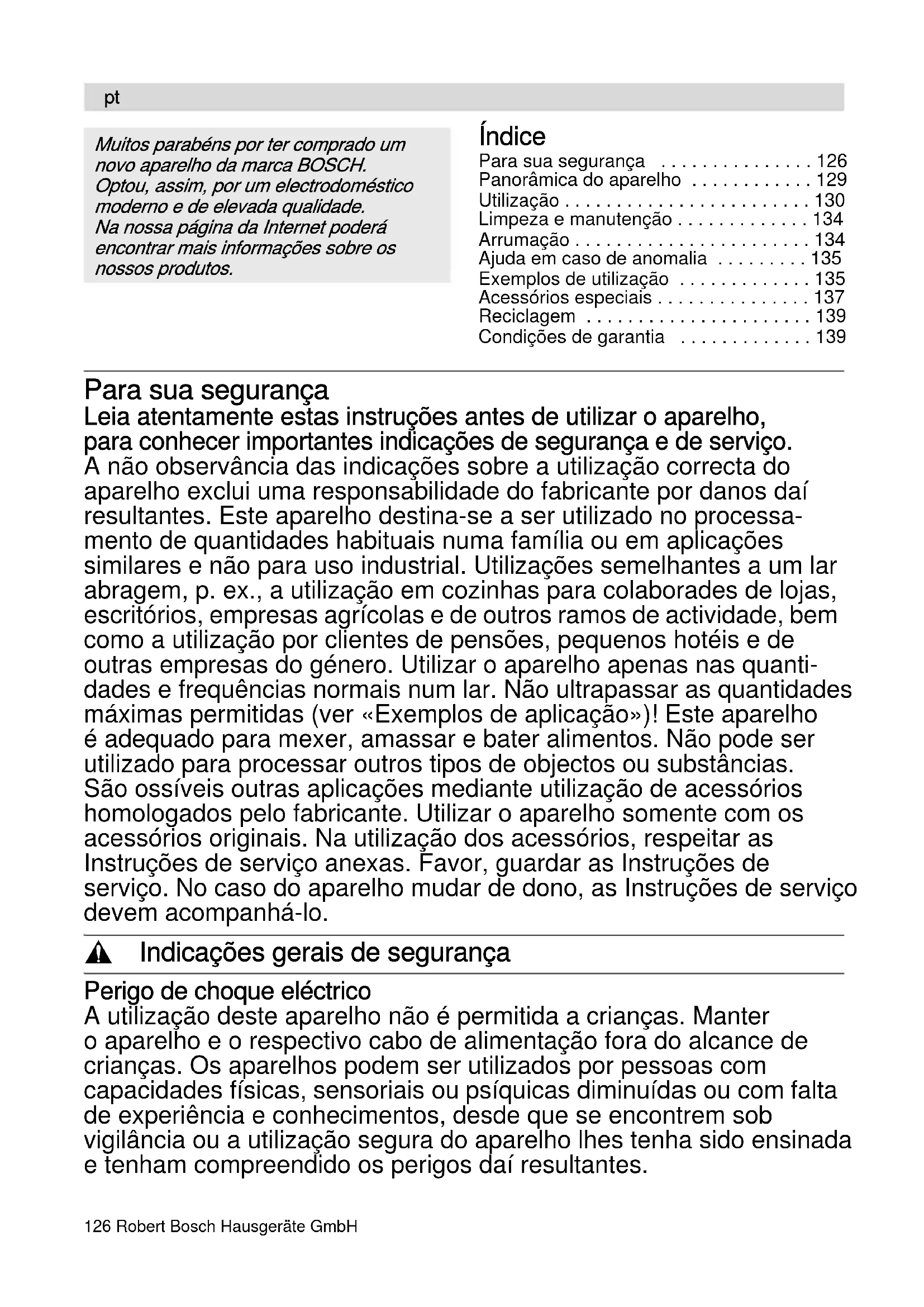 - Nos reservamos el derecho de introducir modificaciones.126 Robert Bosch Hausgeräte GmbH Índice Para sua segurança p. 126